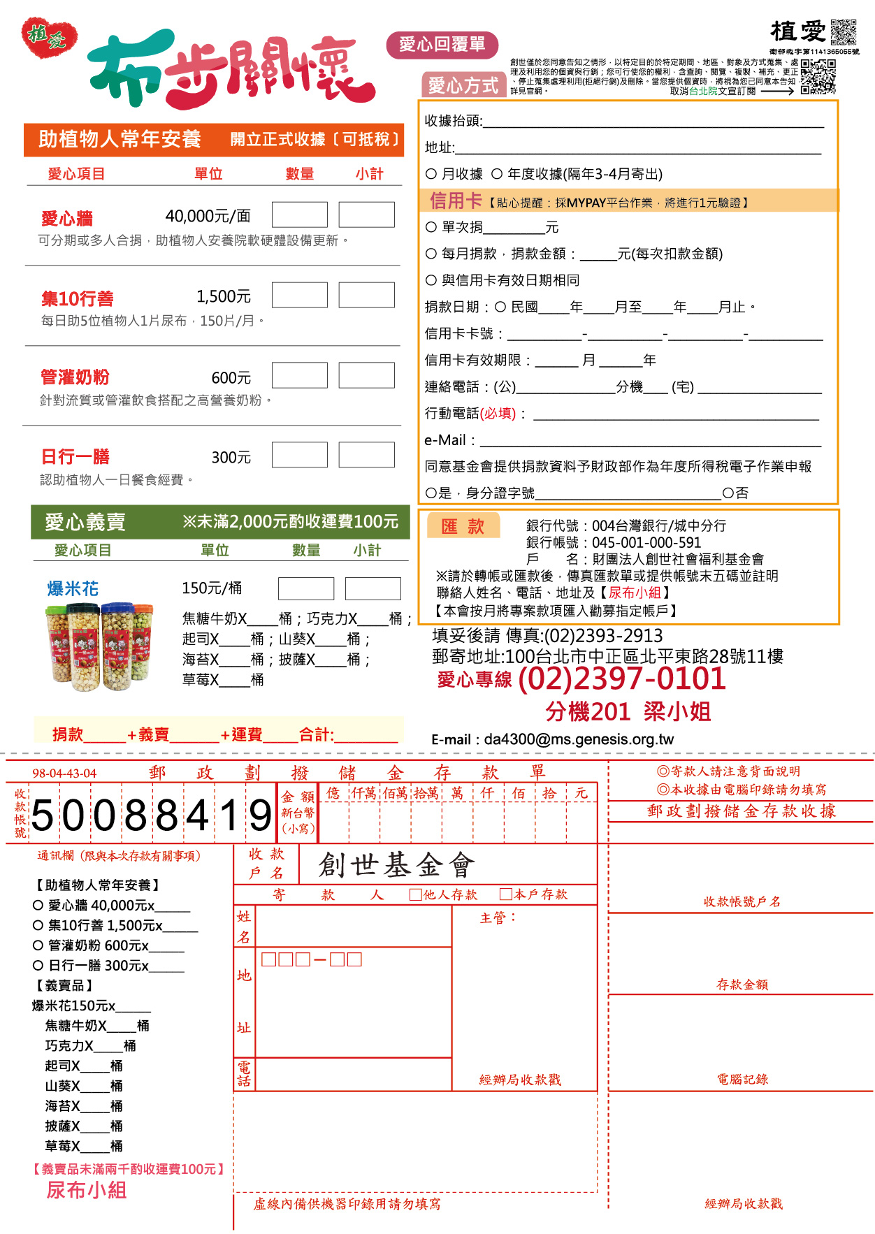 抬頭『財團法人創世社會福利基金會』,連同愛心回覆單掛號寄回。
