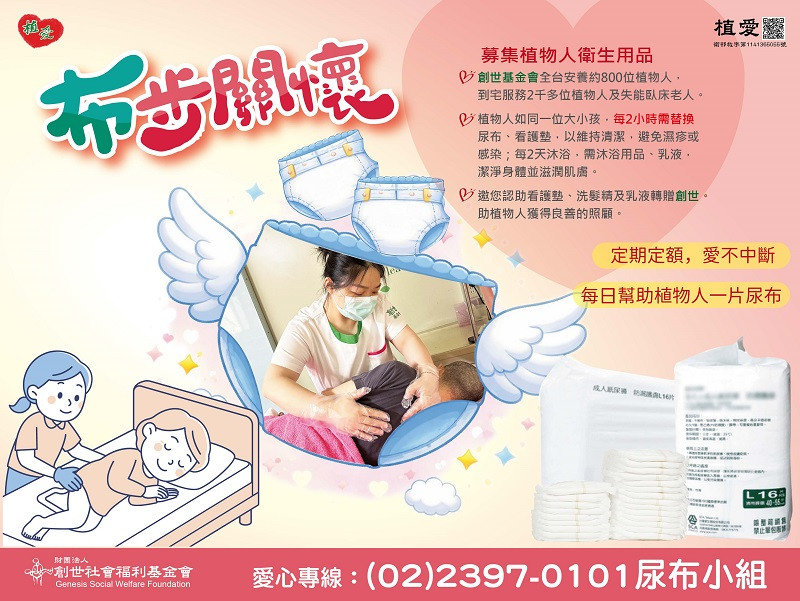 ★邀您認助尿布、奶粉、管灌營養品、看護墊、濕紙巾、衛生紙及抽痰管捐創世,助植物人獲得良善的照顧。