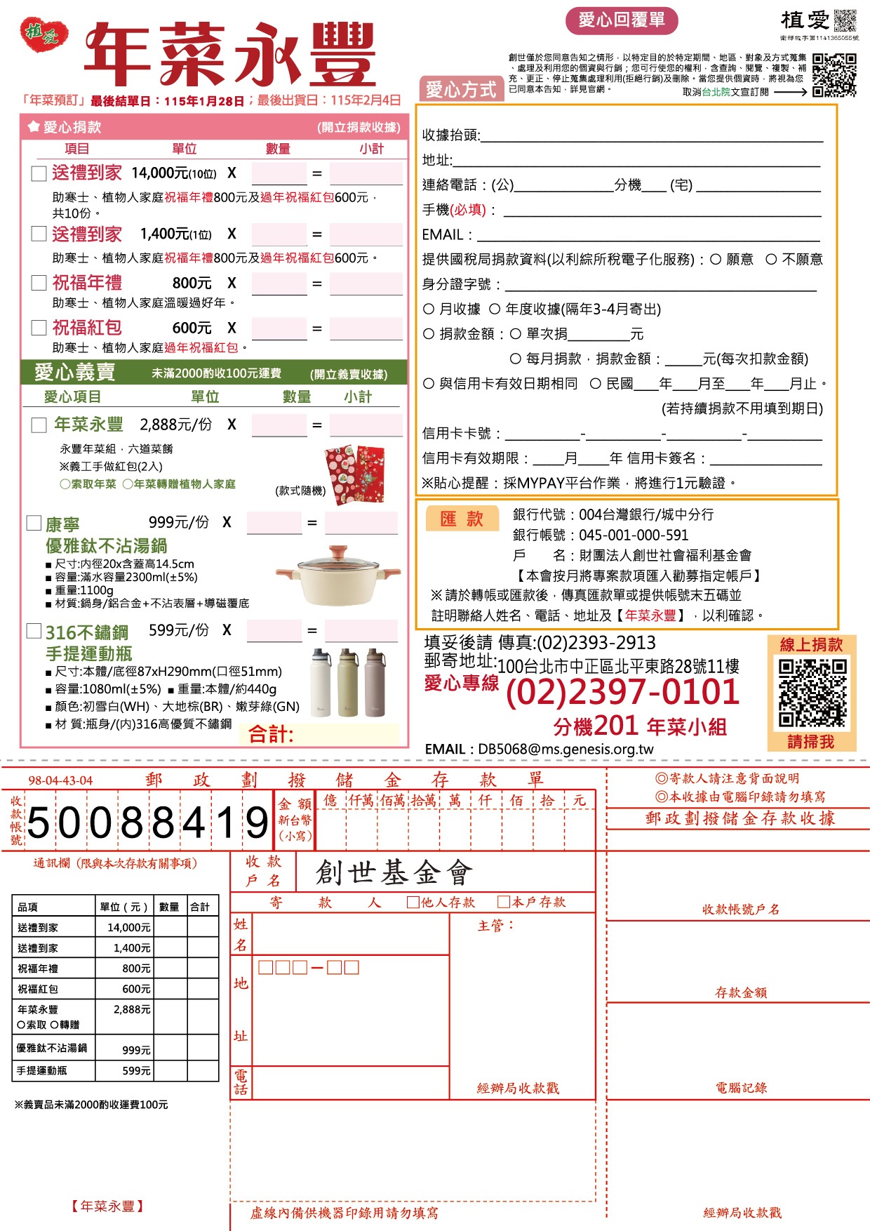 ※轉帳完成後,請來電告知帳號末五碼、收據抬頭、地址,或將存根聯、收據抬頭、電話、地址傳真至(02)2393-2913,註明【年菜小組】,以利開立收據。