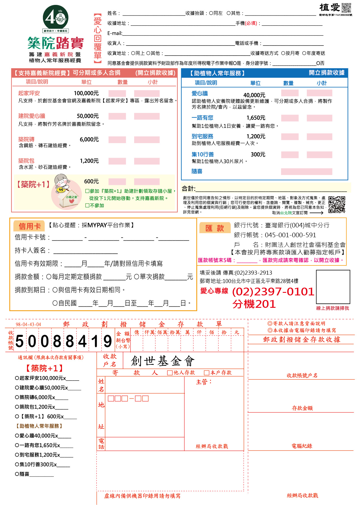 抬頭請開『財團法人創世社會福利基金會』,連同愛心回覆單掛號寄回築院+1小組收。