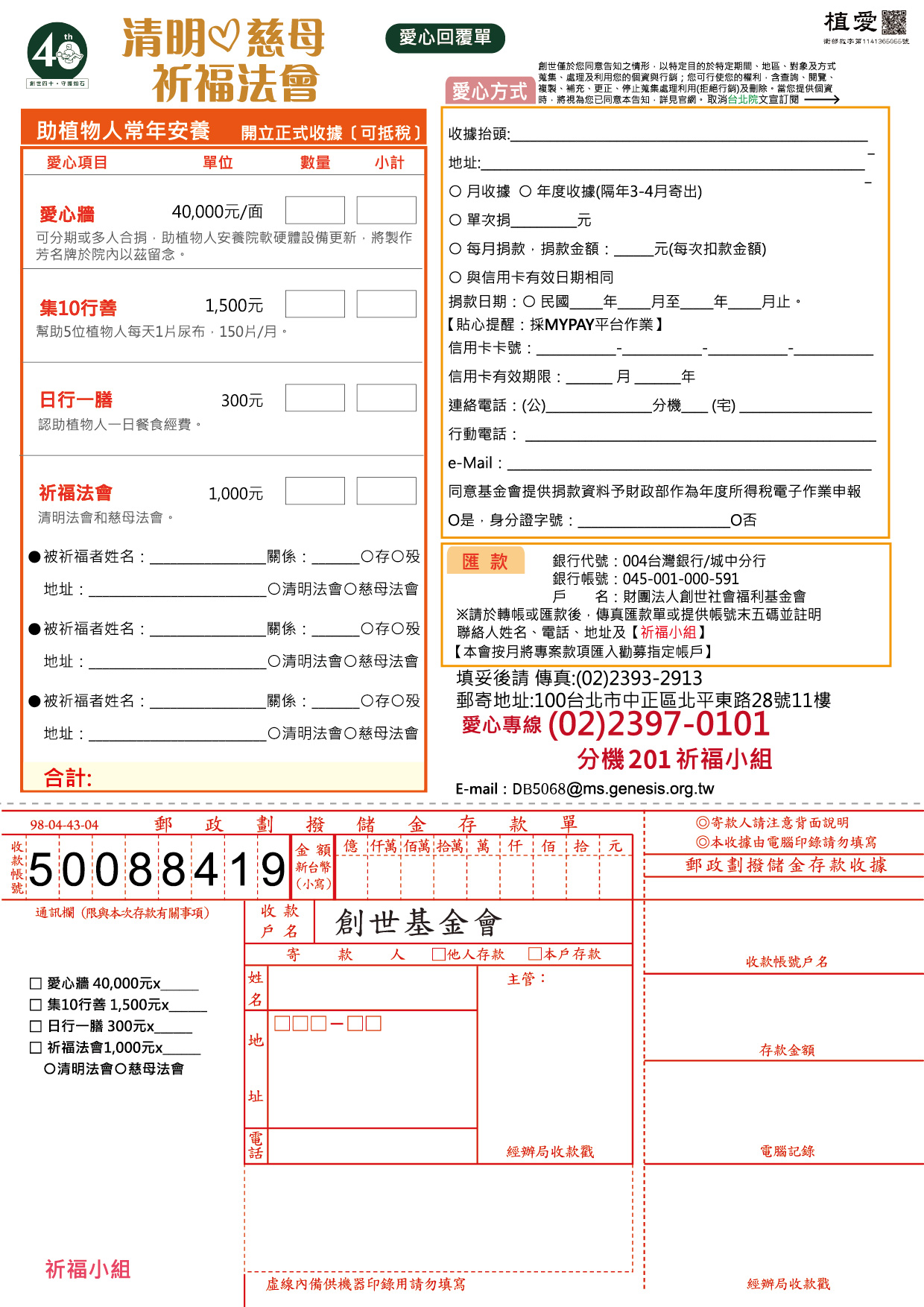 抬頭『財團法人創世社會福利基金會』,連同愛心回覆單掛號寄回。