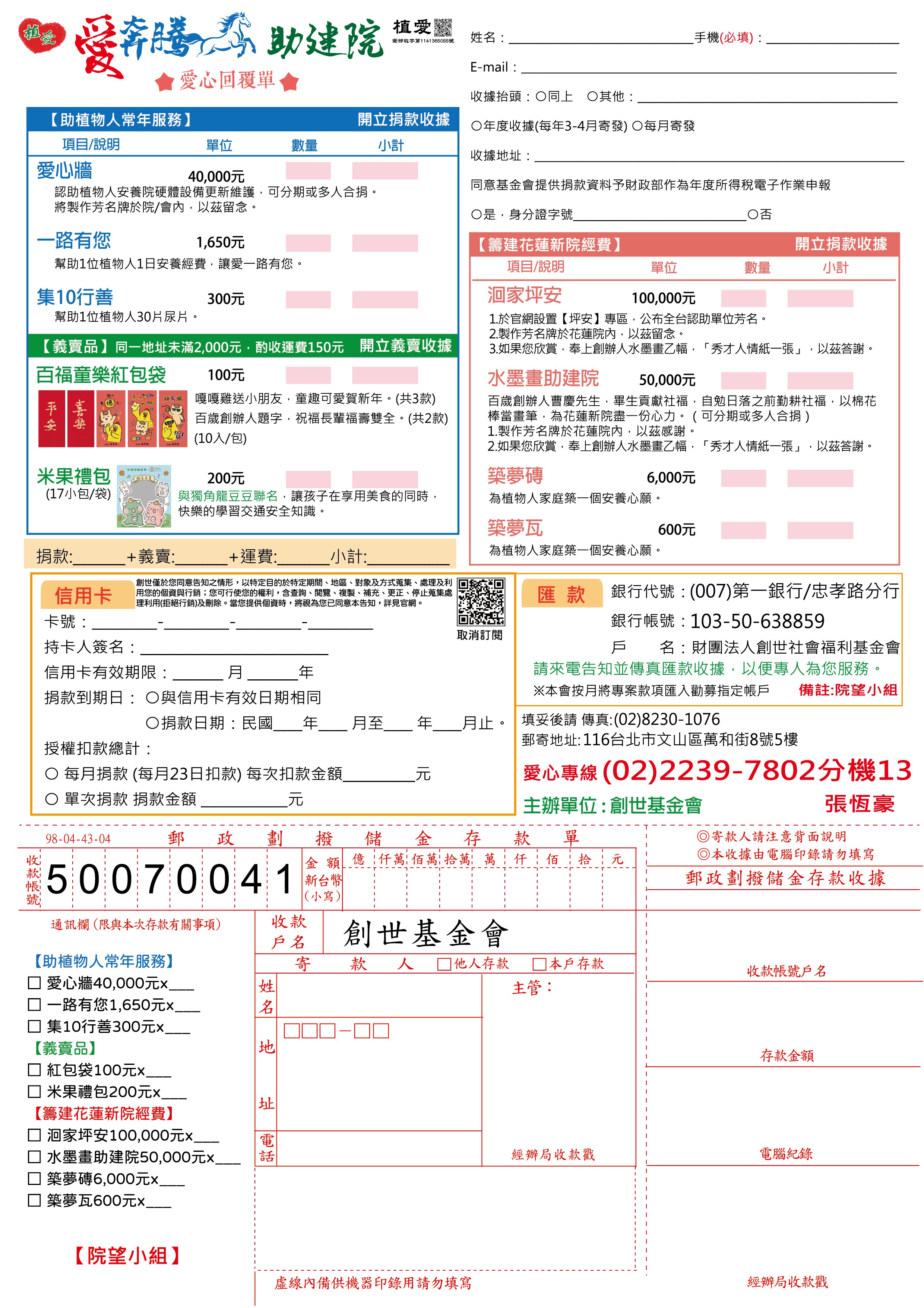 抬頭請開『財團法人創世社會福利基金會』,連同愛心回覆單掛號寄回【院望小組】收。