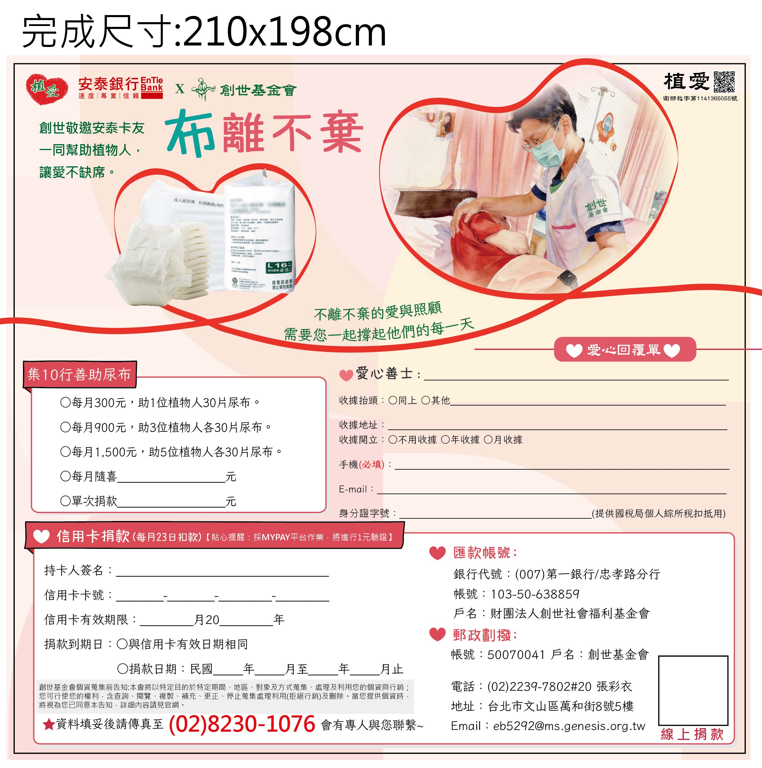 抬頭請開『財團法人創世社會福利基金會』,連同愛心回覆單掛號寄回布離不棄小組收。
