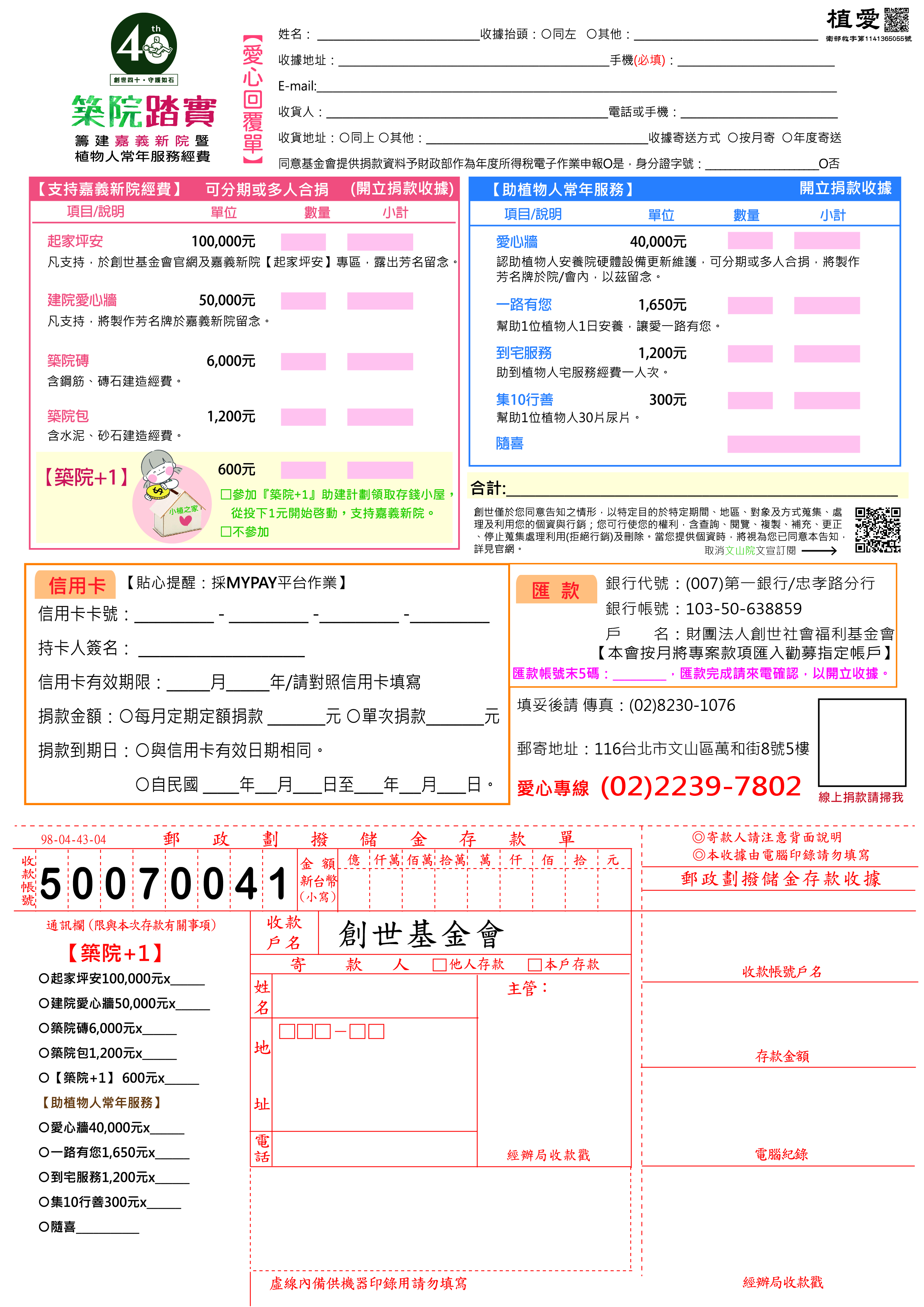 抬頭請開『財團法人創世社會福利基金會』,連同愛心回覆單掛號寄回築院+1小組收。