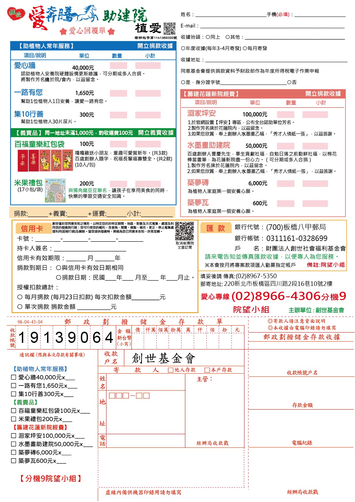 抬頭請開『財團法人創世社會福利基金會』,連同愛心回覆單掛號寄回【院望小組】收。