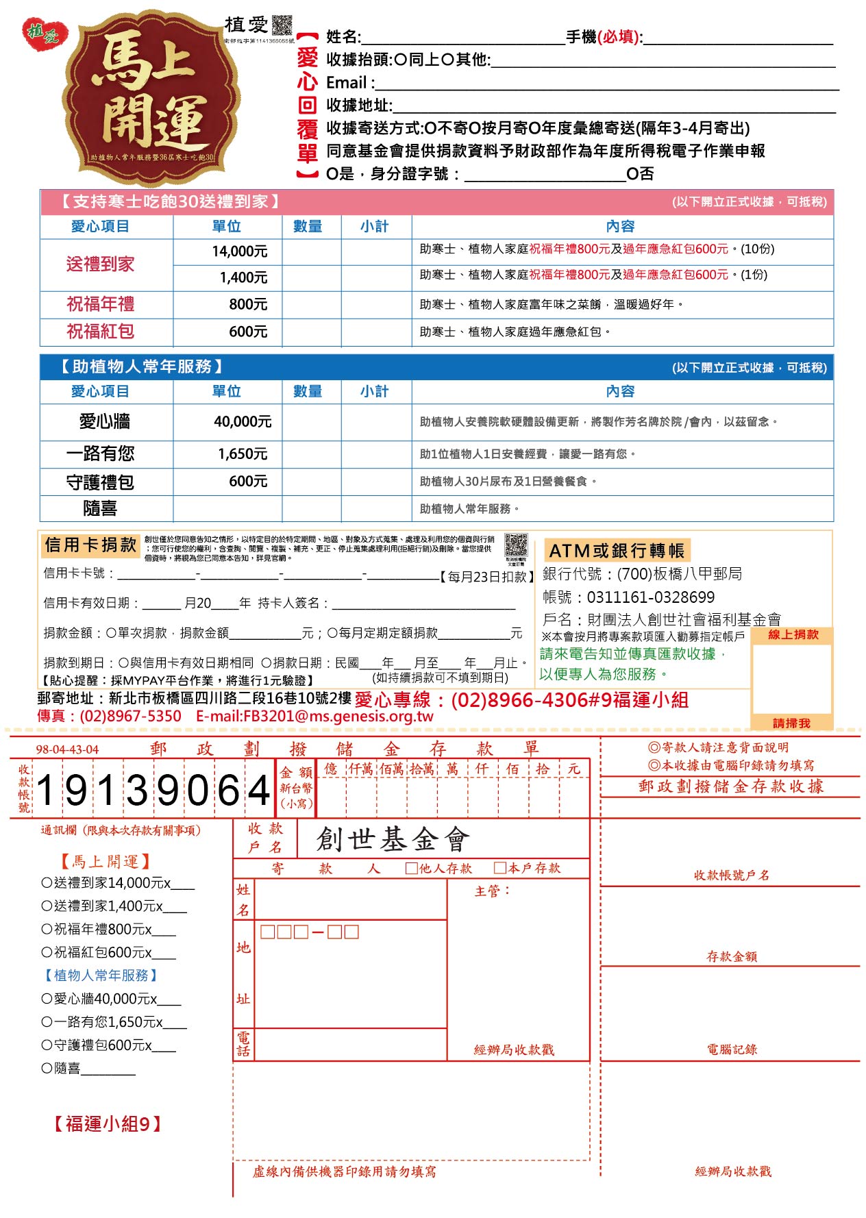 抬頭請開『財團法人創世社會福利基金會』,連同愛心回覆單掛號寄回【福運小組】收。