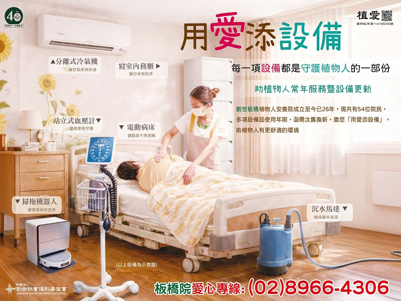 植物人安養是一條漫長且艱辛的道路,需要社會大眾的共同支持,才能為植物人提供更完善的照護,誠摯邀請各界善心人士及企業團體攜手投入公益行列,協助更新安養院內的老舊設備,您的幫助,將匯聚成愛的力量,守護每一位植物人!愛心專線:(02)8966-4306分機9添設備小組。