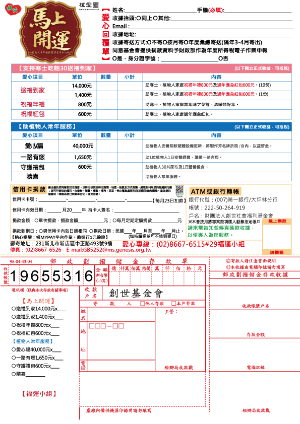 抬頭請開『財團法人創世社會福利基金會』,連同愛心回覆單掛號寄回【福運小組】收。