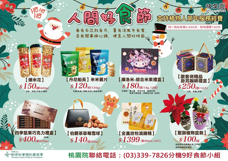 當冷風輕拂、冬日漸深,最溫暖的事莫過於在寒冬中彼此扶持、傳遞關懷。誠摯邀請您參與冬季公益義賣,從酥脆可口的米果零食到溫補滋養的滴雞精,再到香氣四溢的節慶咖啡與冬日巧克力,每一份美味,都是為植物人家庭添上一份暖意的愛。