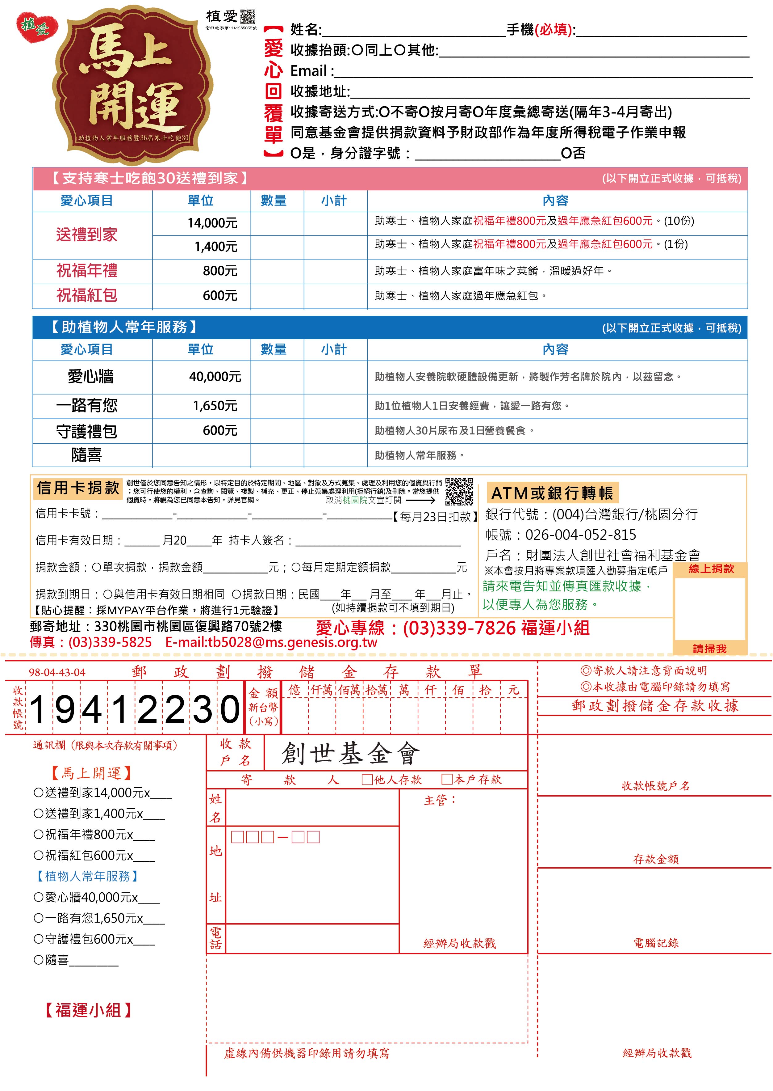 抬頭請開『財團法人創世社會福利基金會』,連同愛心回覆單掛號寄回【福運小組】收。