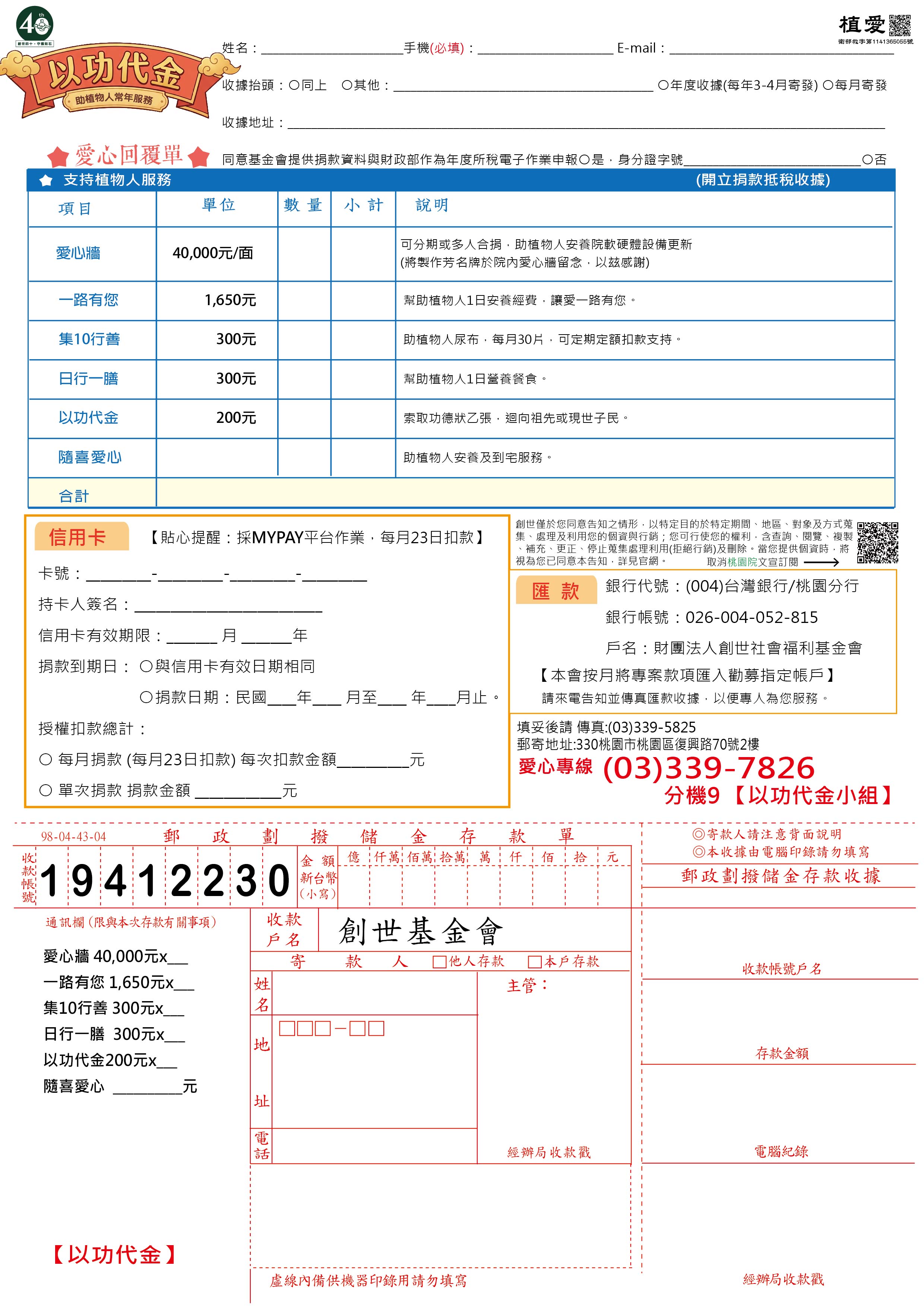 抬頭請開『財團法人創世社會福利基金會』,連同愛心回覆單掛號寄回以功代金小組收。