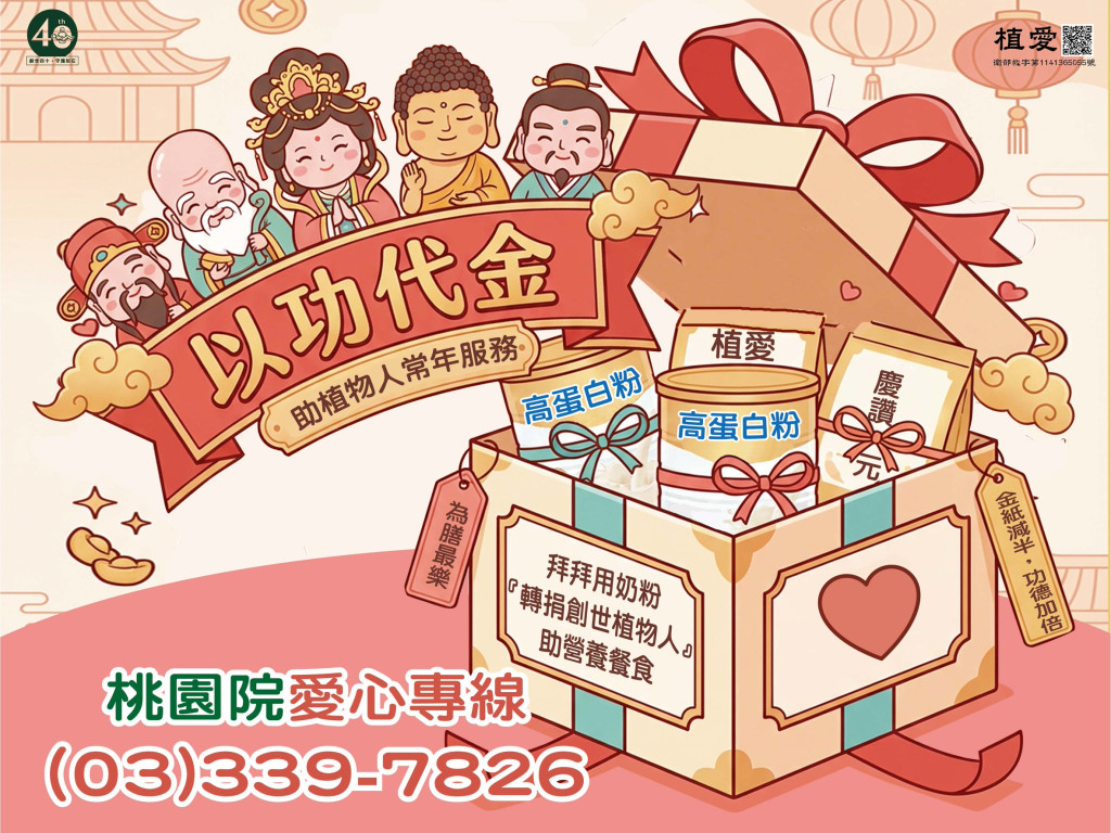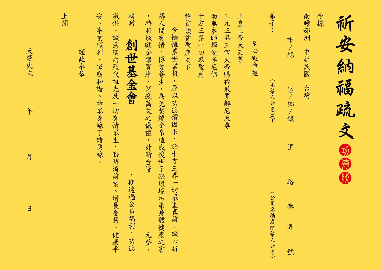 每逢初一、十五拜神、清明節、中元普渡及年節祭拜祖先,誠摯邀請您將購買紙錢的預算,轉捐「創世基金會」助植物人常年服務。以功德狀代替焚香燃燭,於祭祀時虔心念誦,將這份實質的愛心迴向神明及祖先。