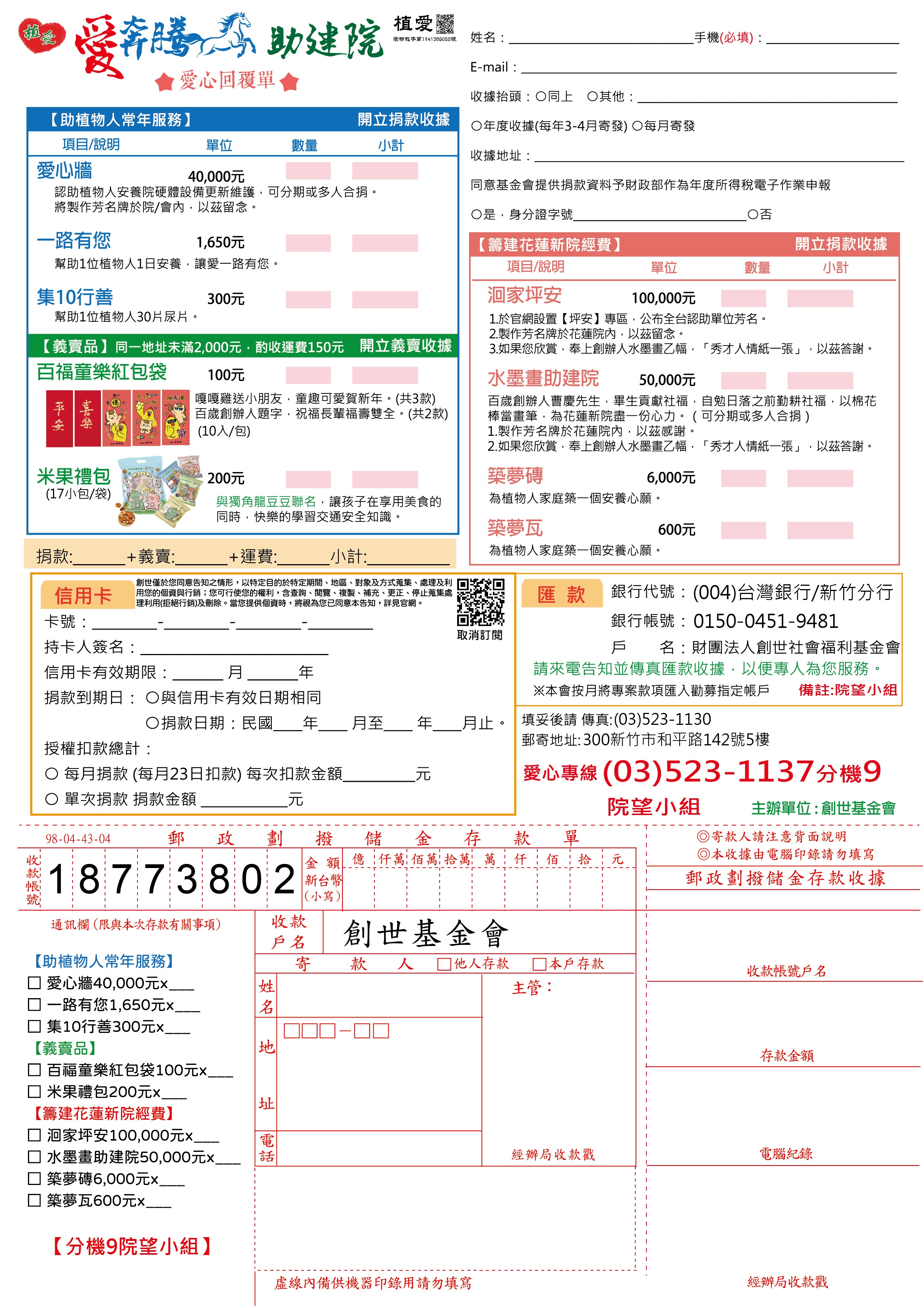 抬頭請開『財團法人創世社會福利基金會』,連同愛心回覆單掛號寄回【院望小組】收。