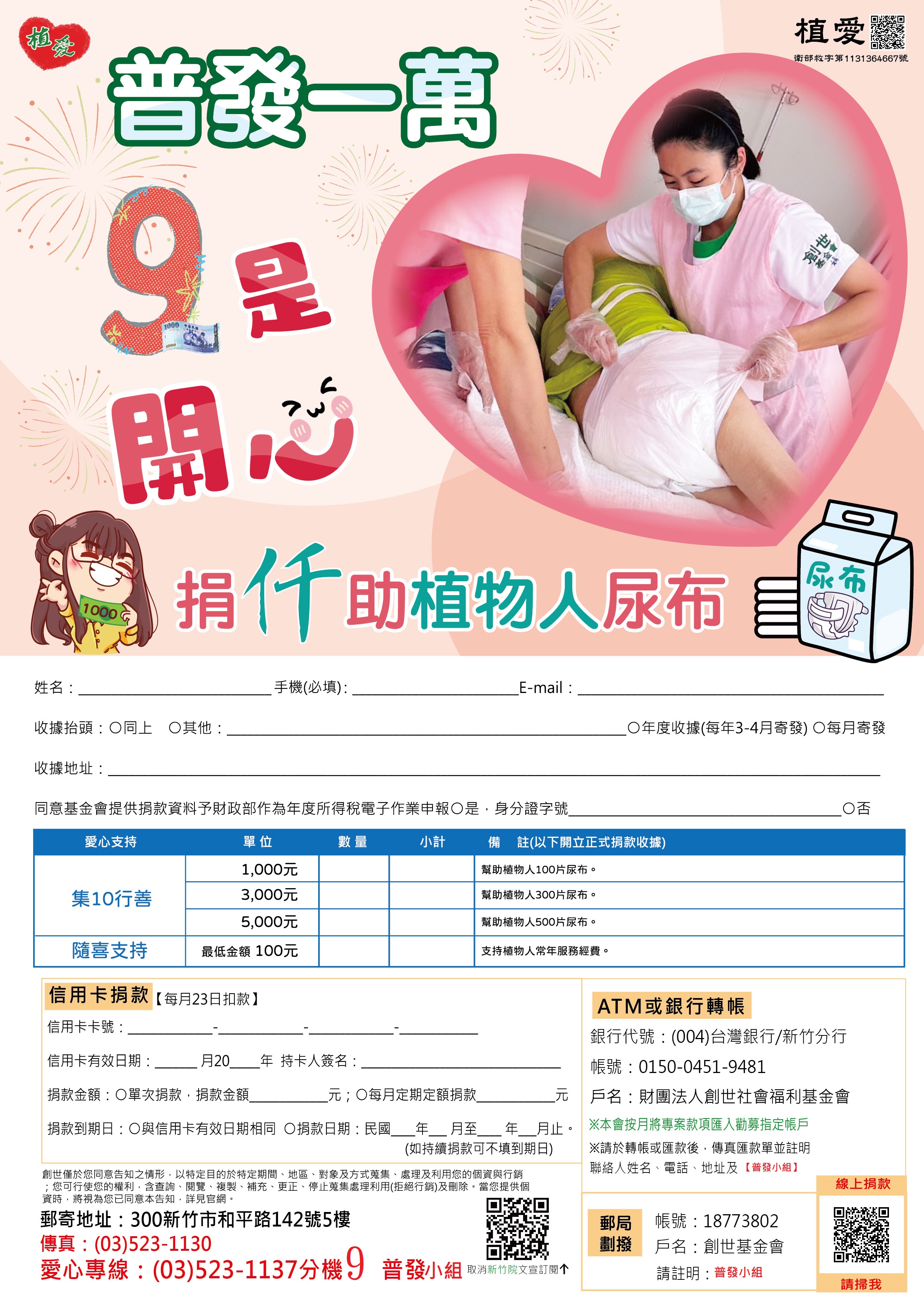 抬頭請開『財團法人創世社會福利基金會』,連同愛心回覆單掛號寄回【普發愛心】收。