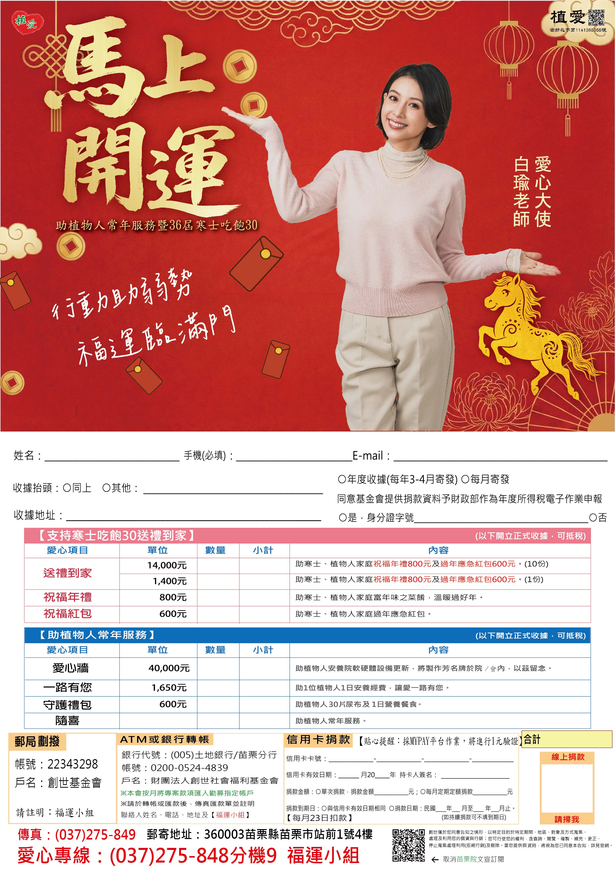 抬頭請開『財團法人創世社會福利基金會』,連同愛心回覆單掛號寄回【福運小組】收。