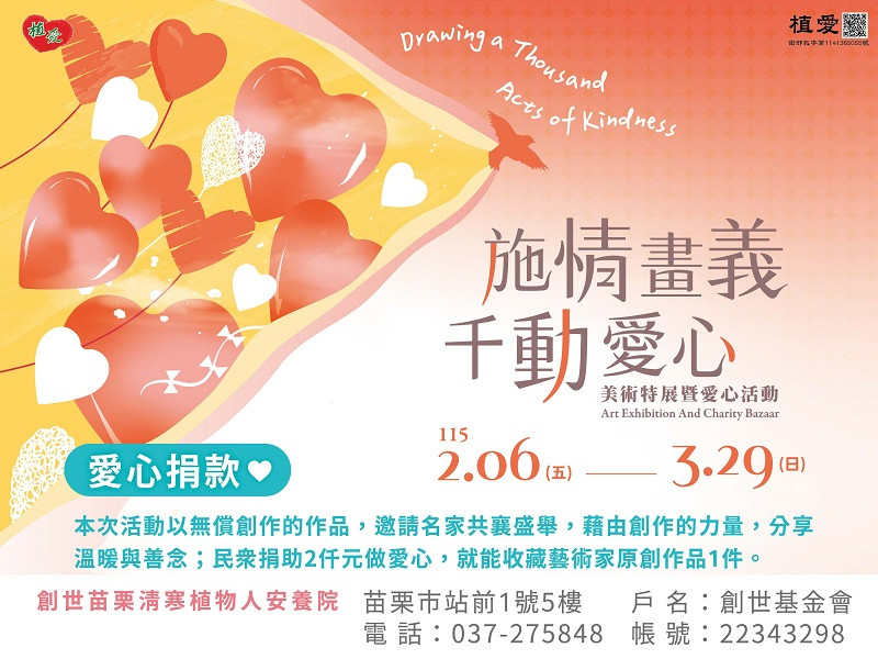 上午9時至12時、下午1時至5時,憑作品兌換券或機構捐款收據至苗栗創世基金會領取作品。