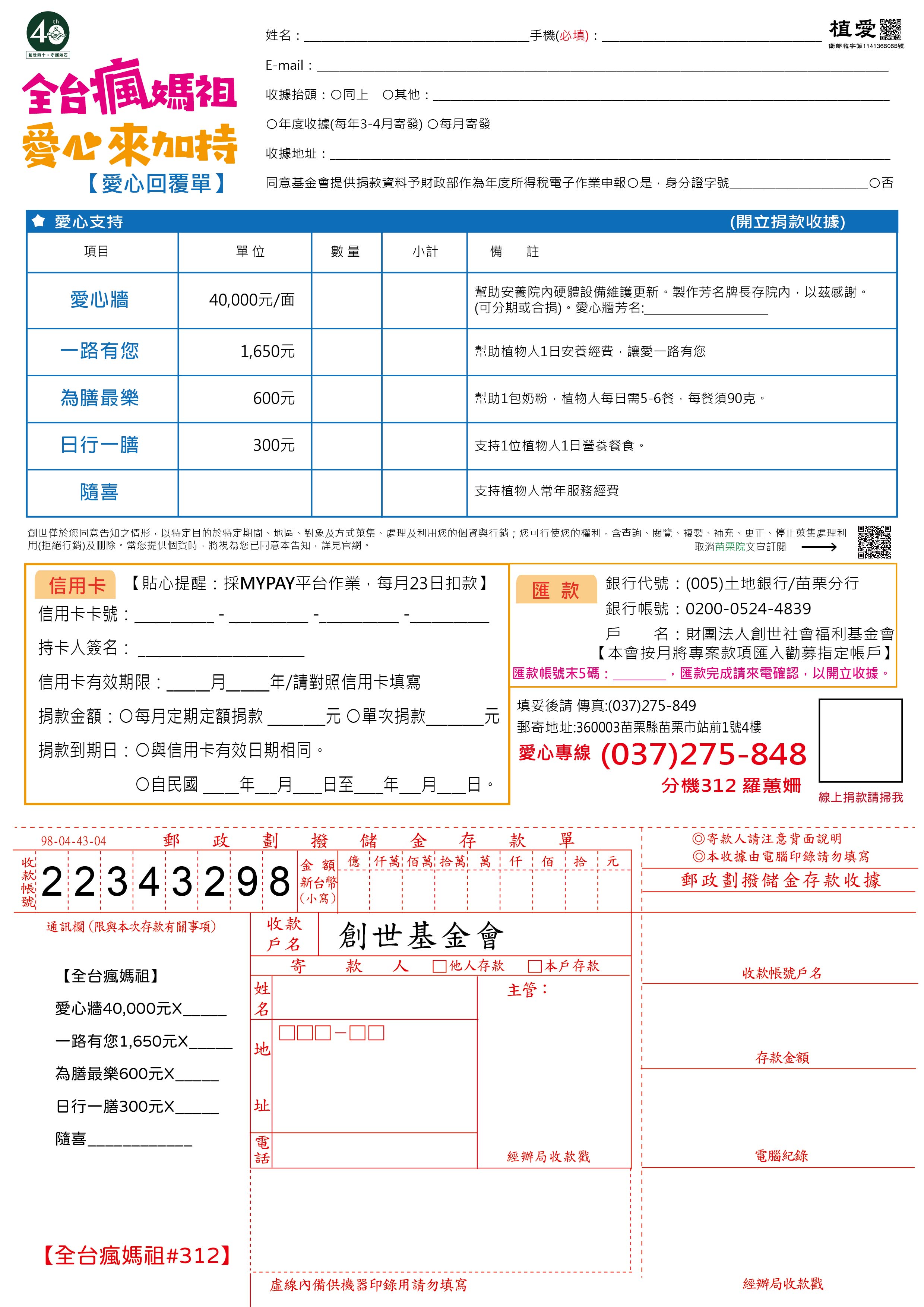 抬頭請開『財團法人創世社會福利基金會』,連同愛心回覆單掛號寄回愛心加持 收。