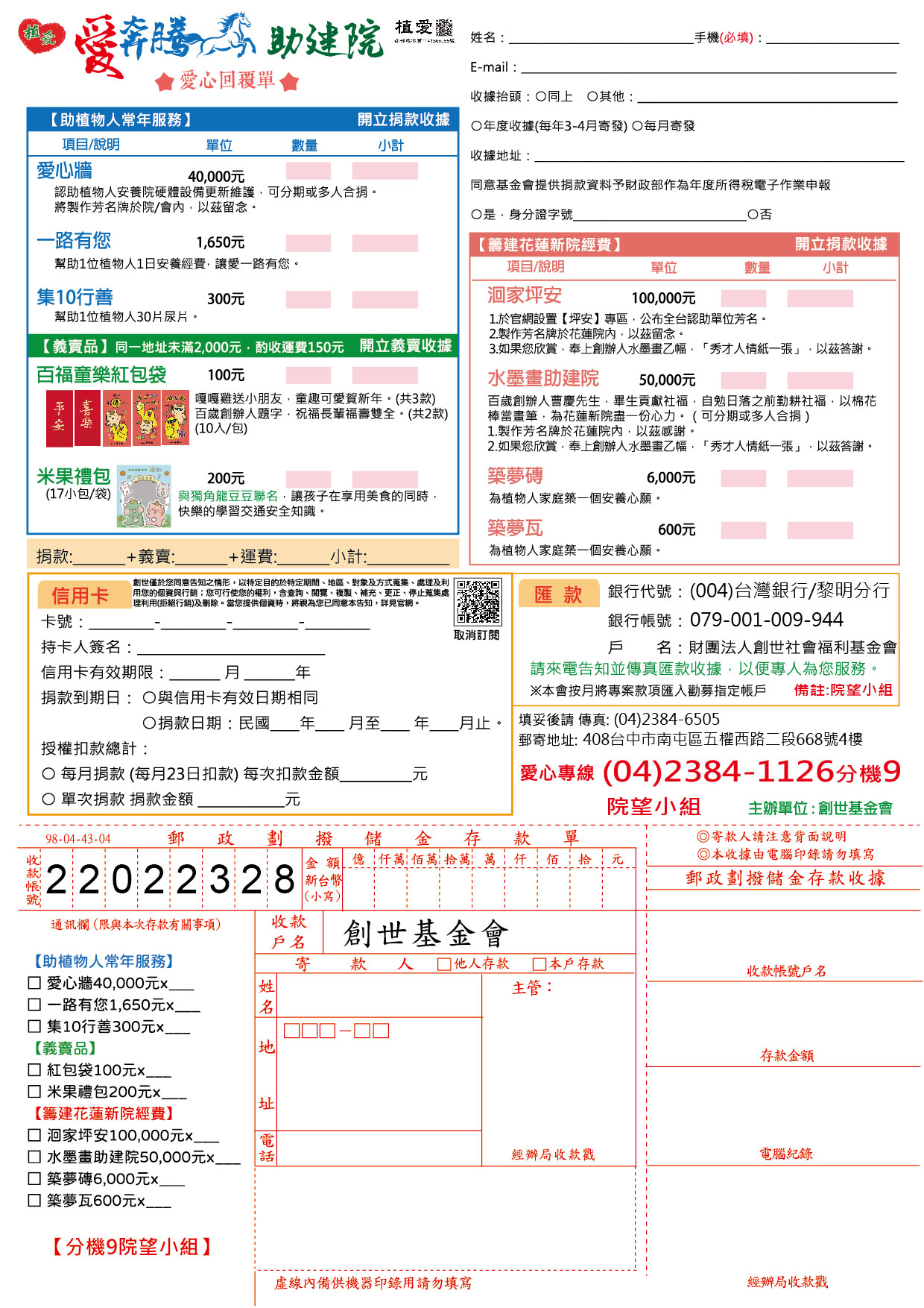 抬頭請開『財團法人創世社會福利基金會』,連同愛心回覆單掛號寄回【院望小組】收。