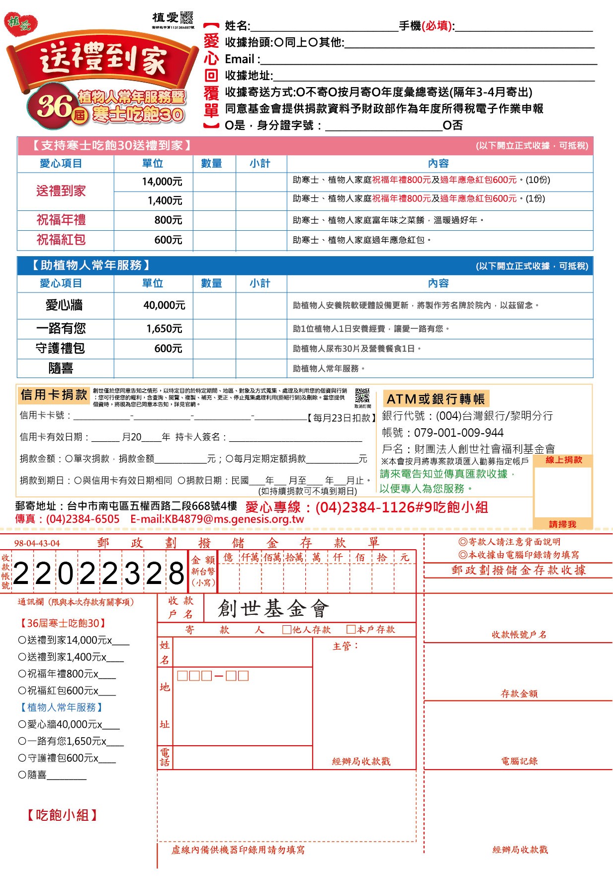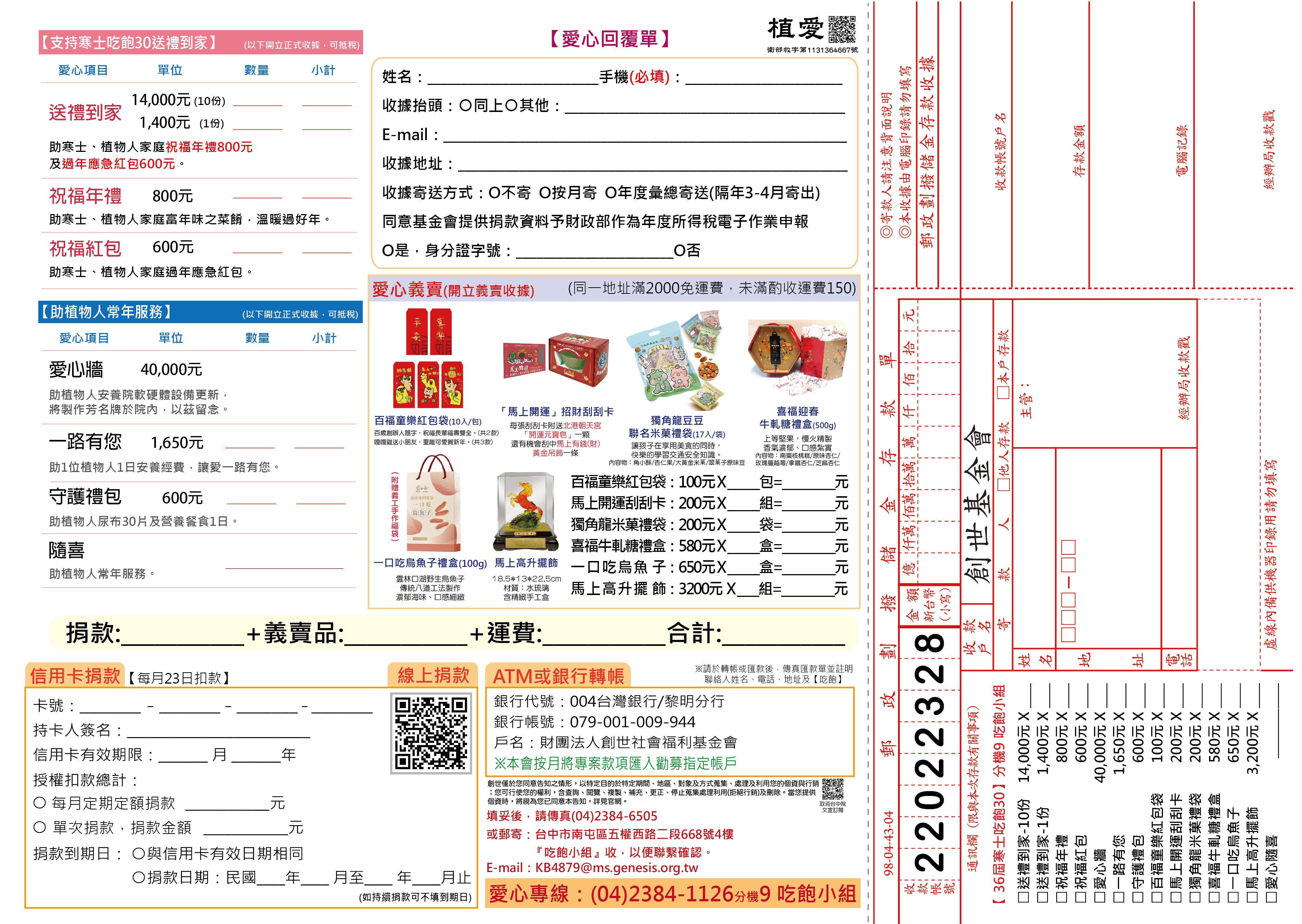 抬頭請開『財團法人創世社會福利基金會』,連同愛心回覆單掛號寄回【吃飽小組】收。