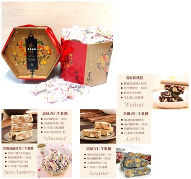 ☆內容物:南棗核桃糕、原味杏仁牛軋糖、玫瑰蔓越莓牛軋糖、拿鐵杏仁牛軋糖、芝麻杏仁牛軋糖