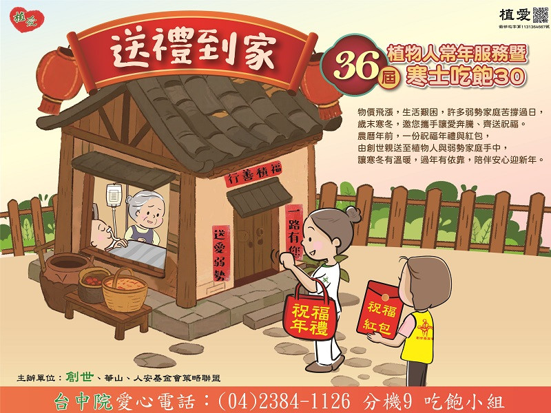 歲末寒冬,邀您攜手讓愛奔騰、齊送祝福。農曆年前,一份祝福年禮與紅包,由創世親送至植物人與弱勢家庭手中,讓寒冬有溫暖、過年有依靠,陪伴他們安心迎新年。