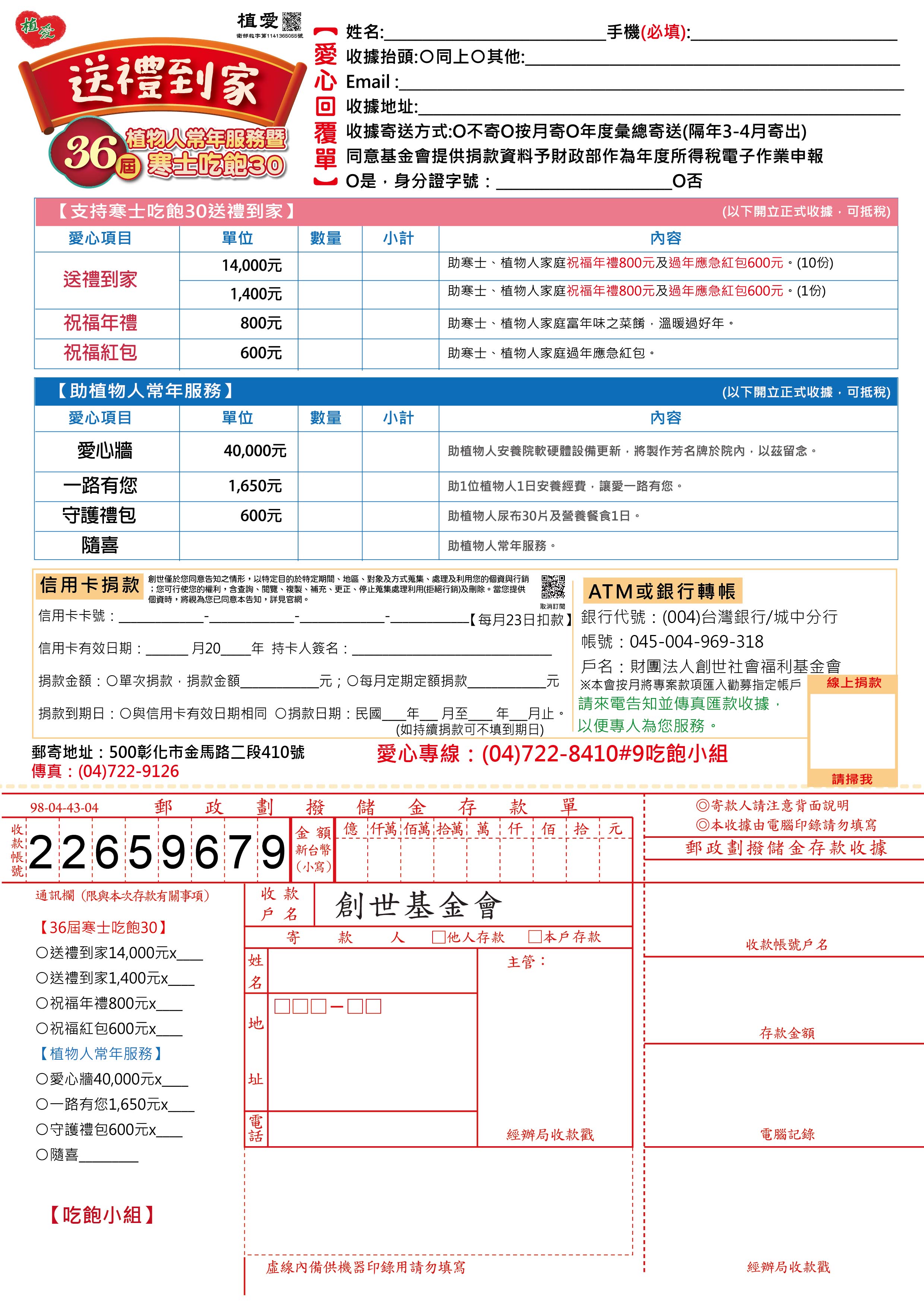 抬頭請開『財團法人創世社會福利基金會』,連同愛心回覆單掛號寄回【吃飽小組】收。