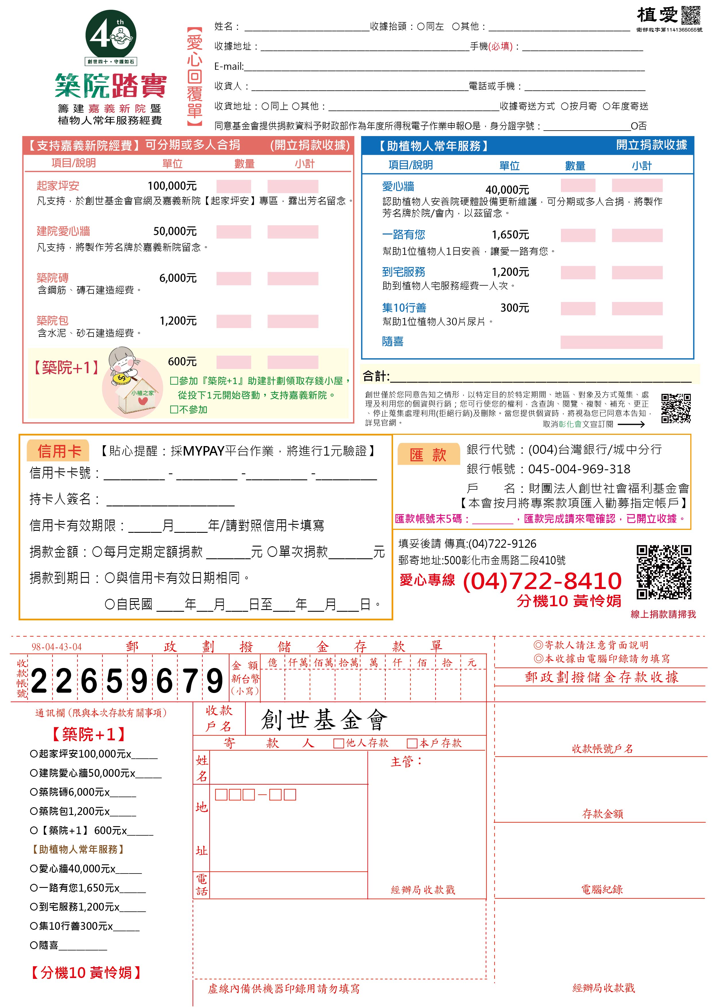抬頭請開『財團法人創世社會福利基金會』,連同愛心回覆單掛號寄回築院+1小組收。