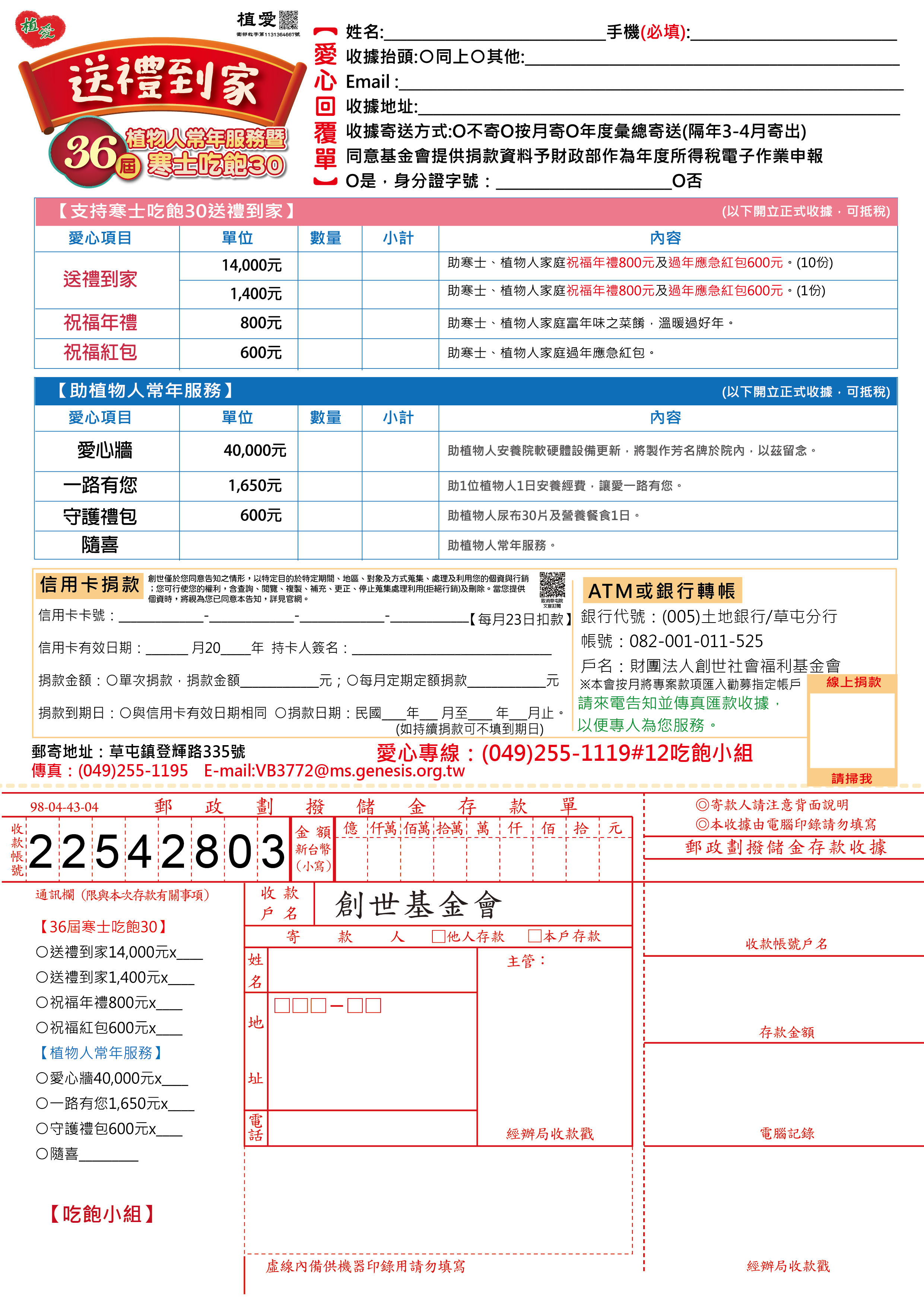 抬頭請開『財團法人創世社會福利基金會』,連同愛心回覆單掛號寄回【吃飽小組】收。