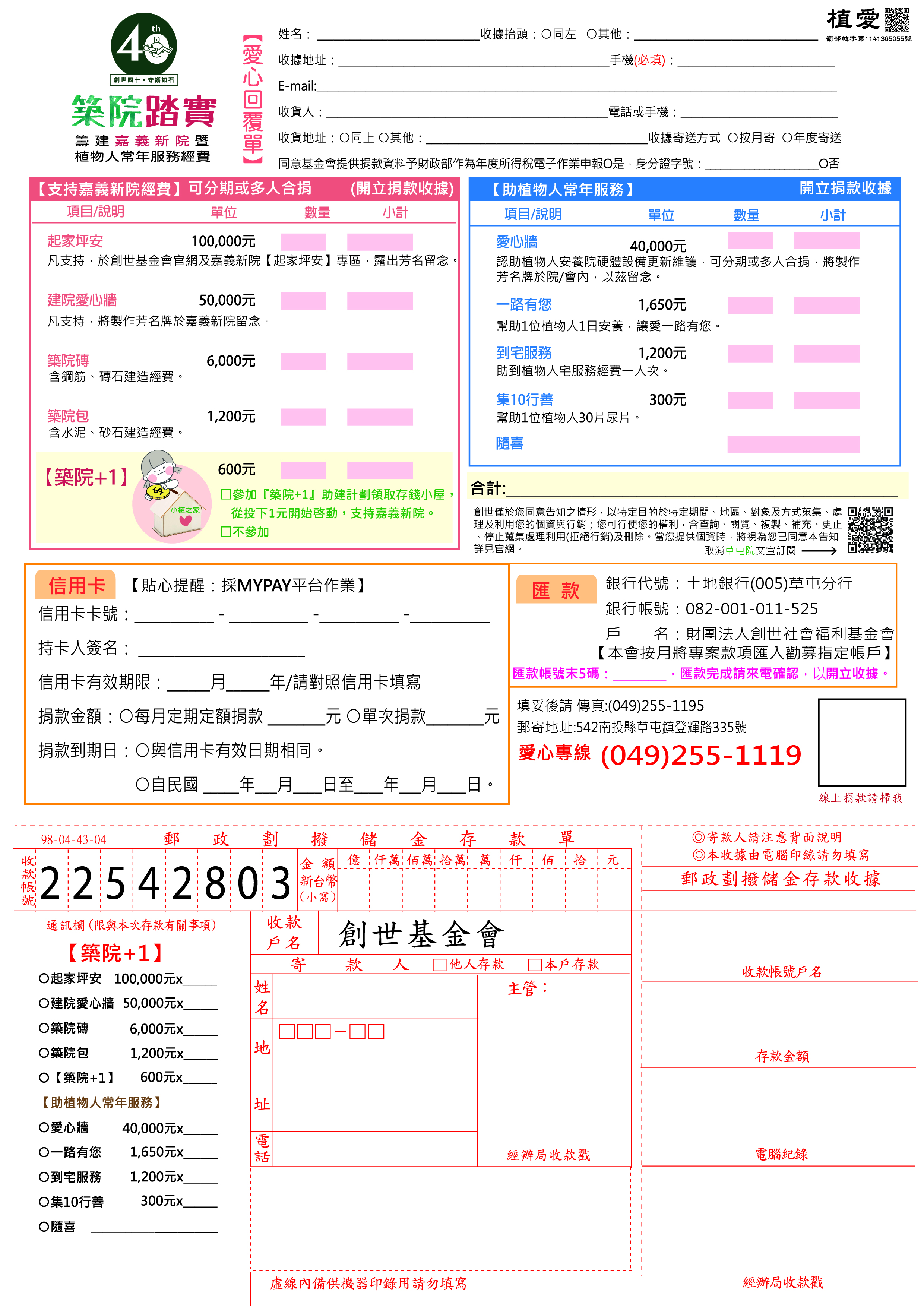 抬頭請開『財團法人創世社會福利基金會』,連同愛心回覆單掛號寄回築院+1小組收。