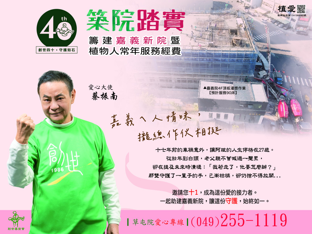 然而,在許多我們看不見的社會角落,仍有無數弱勢家庭正苦苦等待援助。嘉義院目前已滿床,卻仍有許多個案急需入住。為了不讓家庭在無助中崩潰,我們誠摯邀請您一起助建植物人的堡壘──嘉義新院,為等待中的生命撐起一個可以安心託付的家。