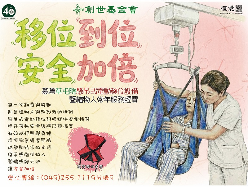 邀請您守護植物人,讓移位到位,安全加倍。請洽創世草屯院:049-2551119。