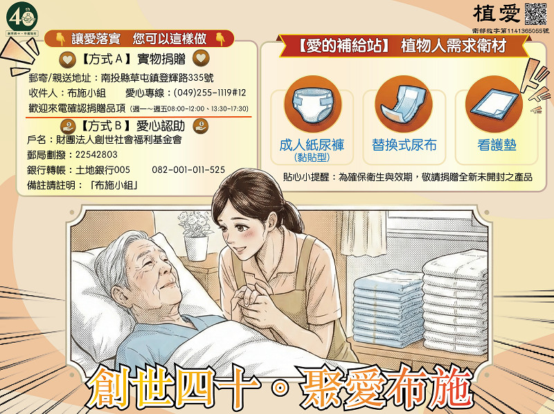 每位植物人每日約需10-12片尿布,草屯安養院每月需求2萬多片,懇請每月愛心300元支持尿布,或 直接購買尿布(L-XL)郵寄至安養院
