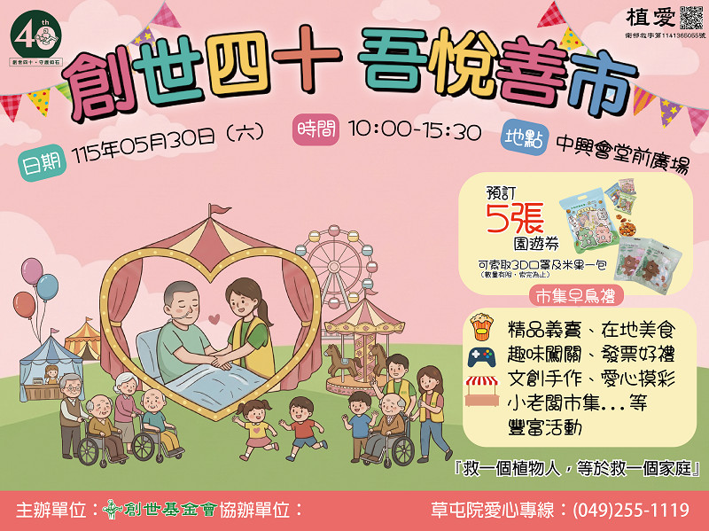 5月30日,愛在南投綻放生根,透過「吾悅善市」公益市集,匯聚在地良善力量,延續溫柔的堅持。邀您與家人朋友一起做公益、獻愛心,用行動支持植物人服務,活動當天除精選30個攤位,也有趣味闖關、發票索好禮、愛心摸彩與小老闆市集……等豐富活動內容。