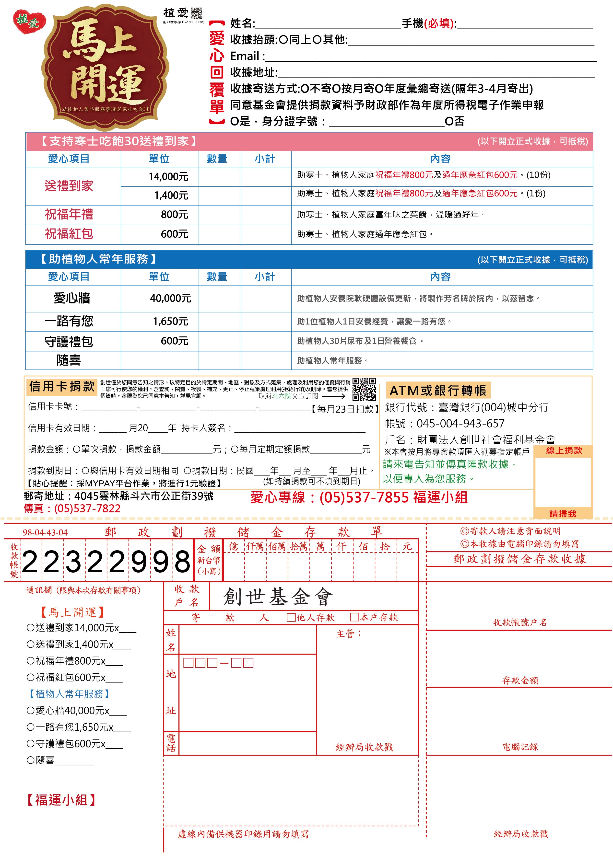 抬頭請開『財團法人創世社會福利基金會』,連同愛心回覆單掛號寄回【福運小組】收。