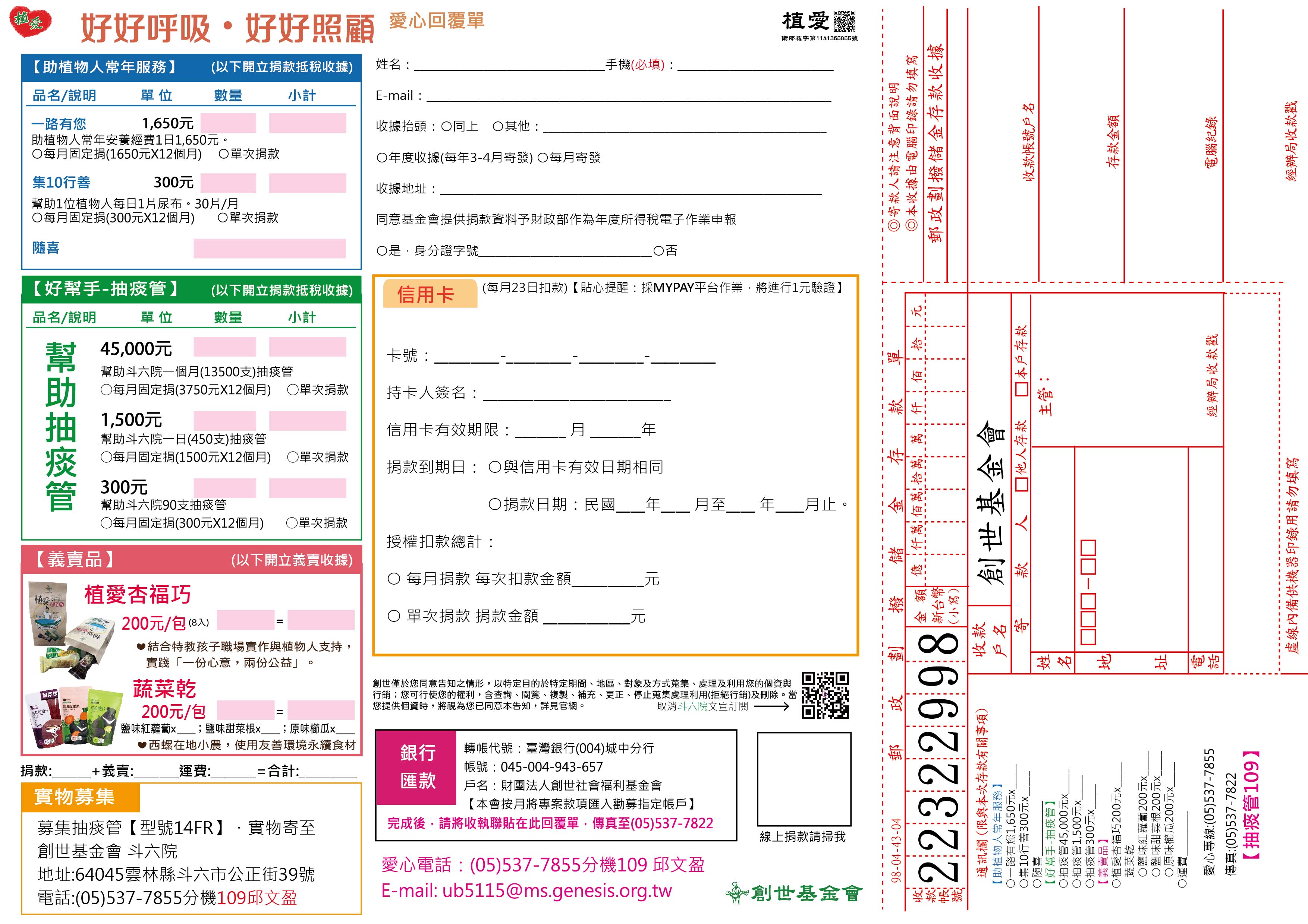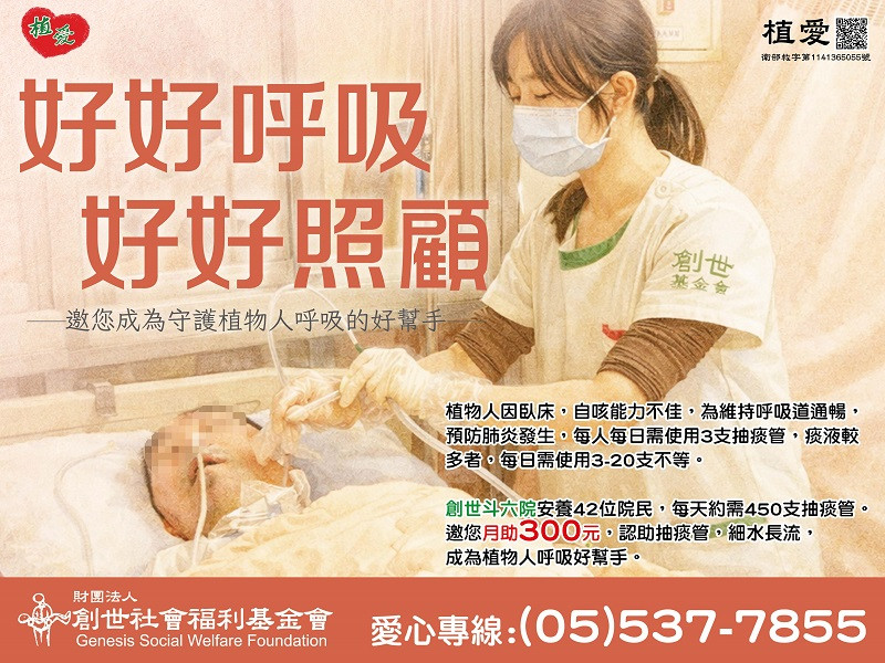 戶名:創世基金會 帳號:22322998 *請於通訊欄註明:《抽痰管》