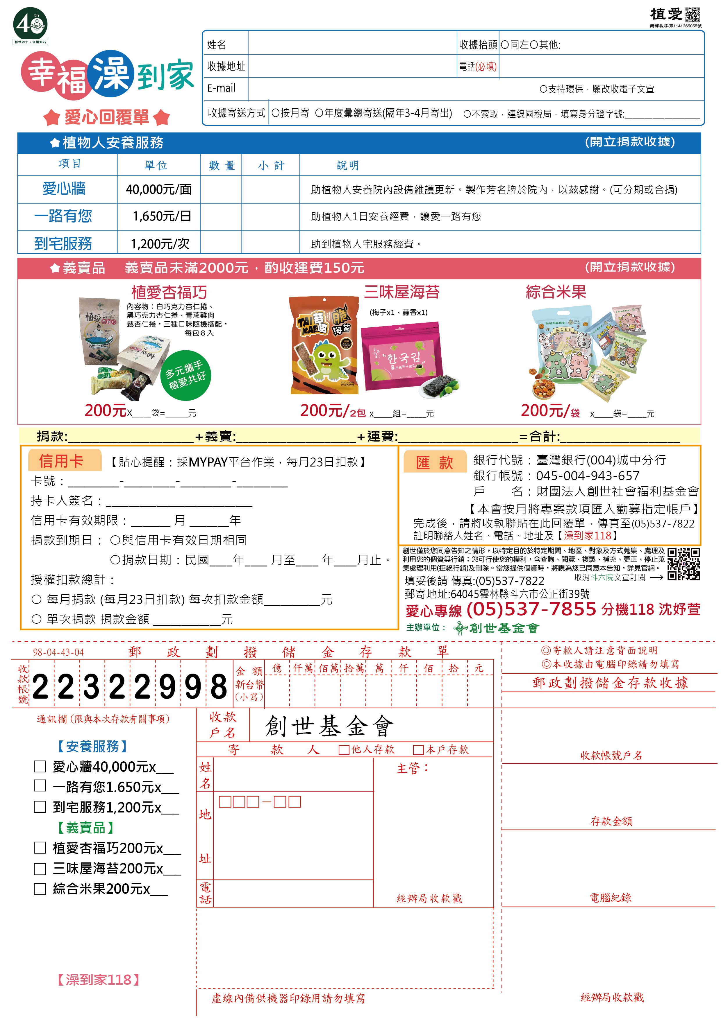 ※轉帳完成,請來電告知帳號末五碼、收據抬頭、地址,或將存根聯、收據抬頭、電話、地址傳真至(05)537-7822,註明【幸福澡到家】,以利開立收據。
