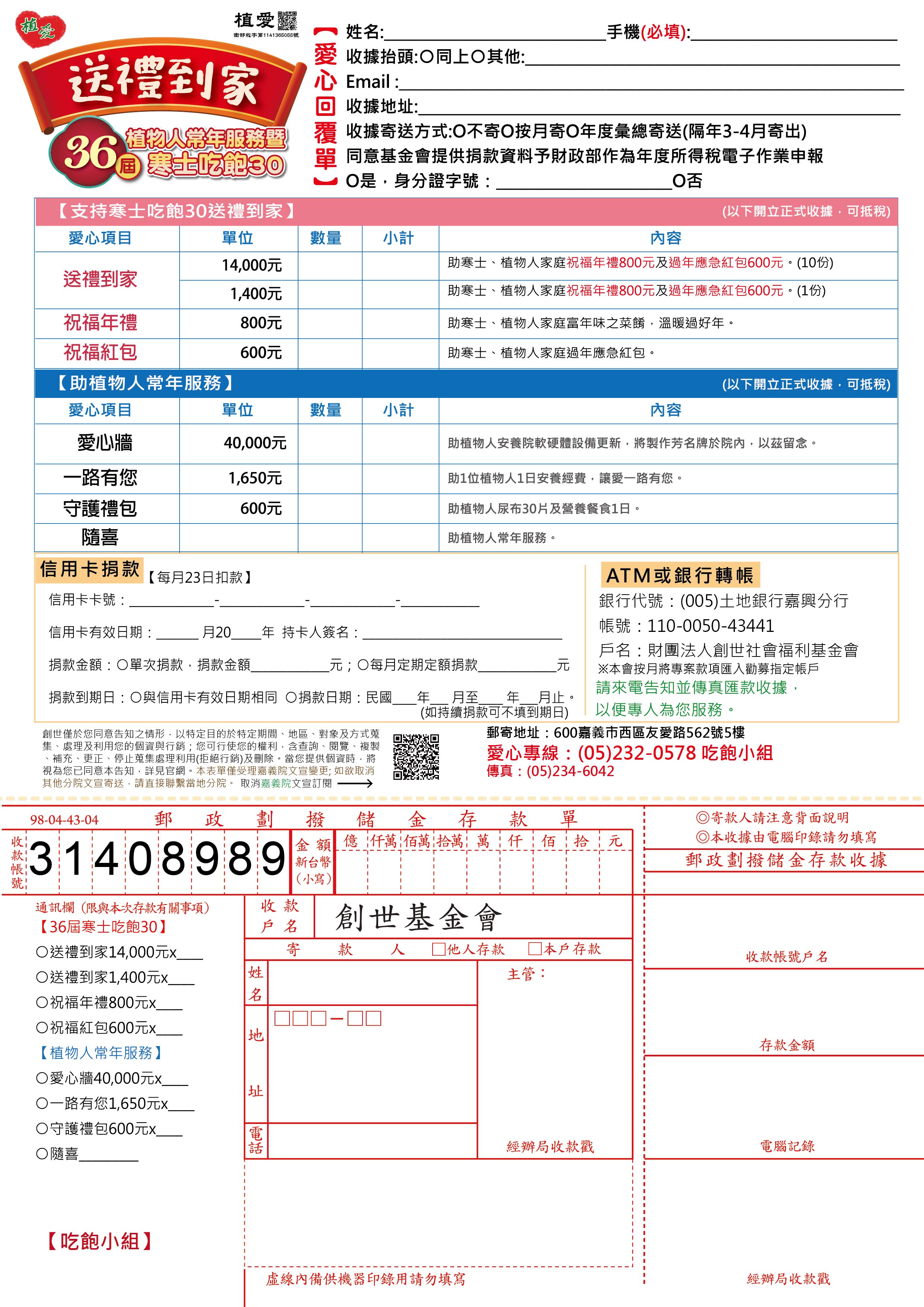 抬頭請開『財團法人創世社會福利基金會』,連同愛心回覆單掛號寄回【吃飽小組】收。