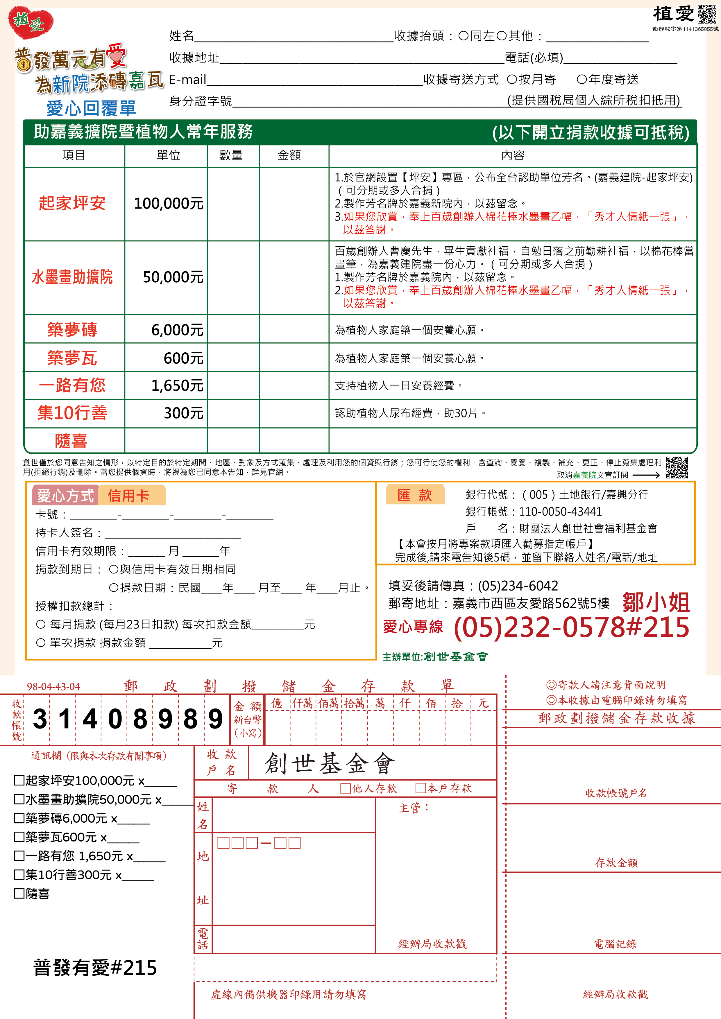 連同愛心回覆單掛號寄回【嘉瓦215】收。