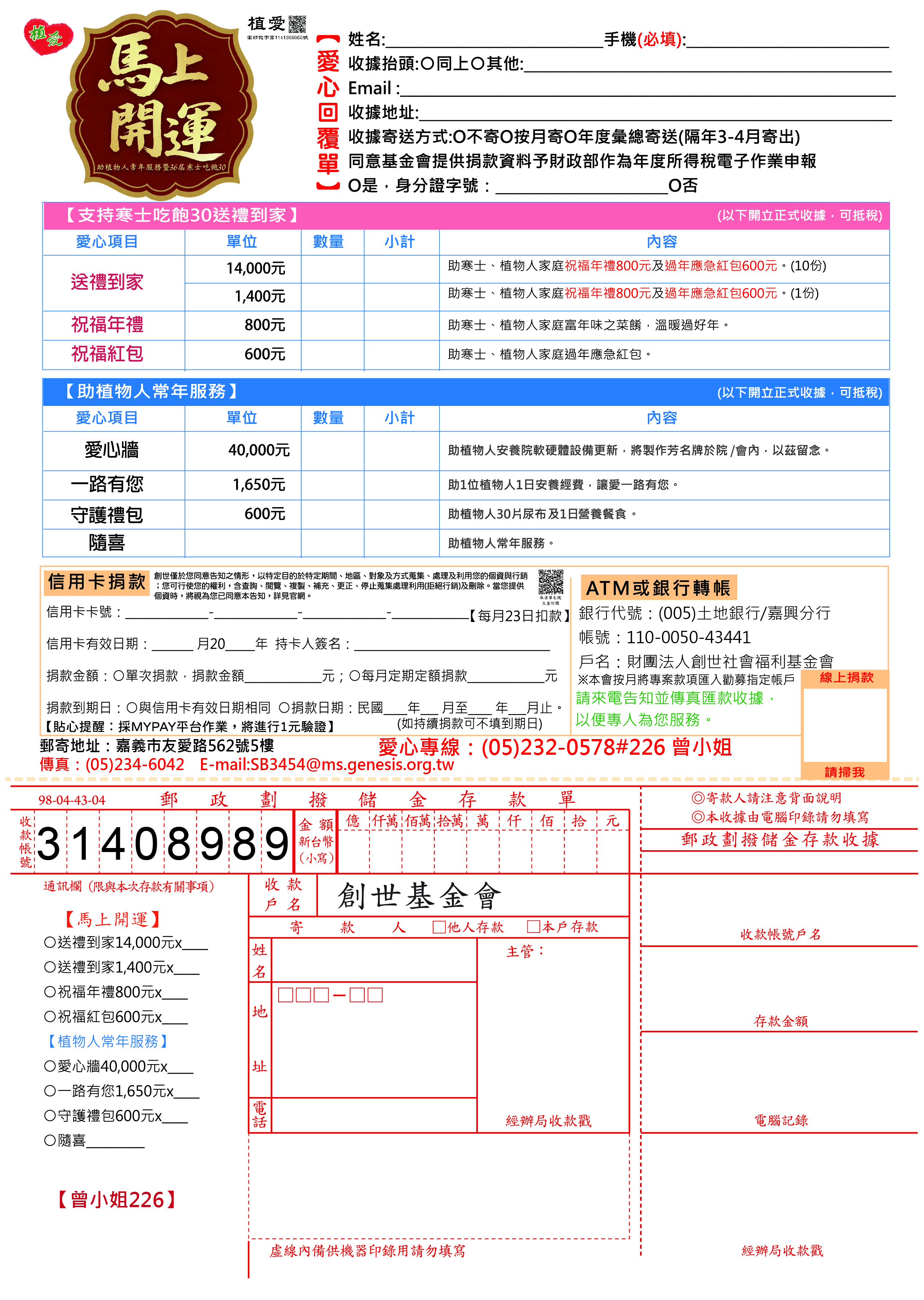 抬頭請開『財團法人創世社會福利基金會』,連同愛心回覆單掛號寄回【福運小組】收。
