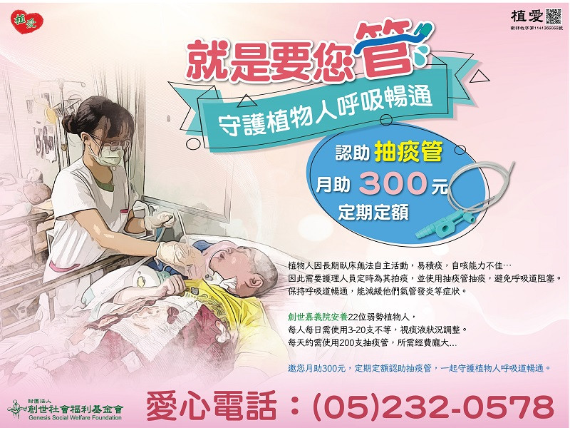 邀您月助300元,定期定額認助抽痰管,一起守護植物人呼吸道暢通。
