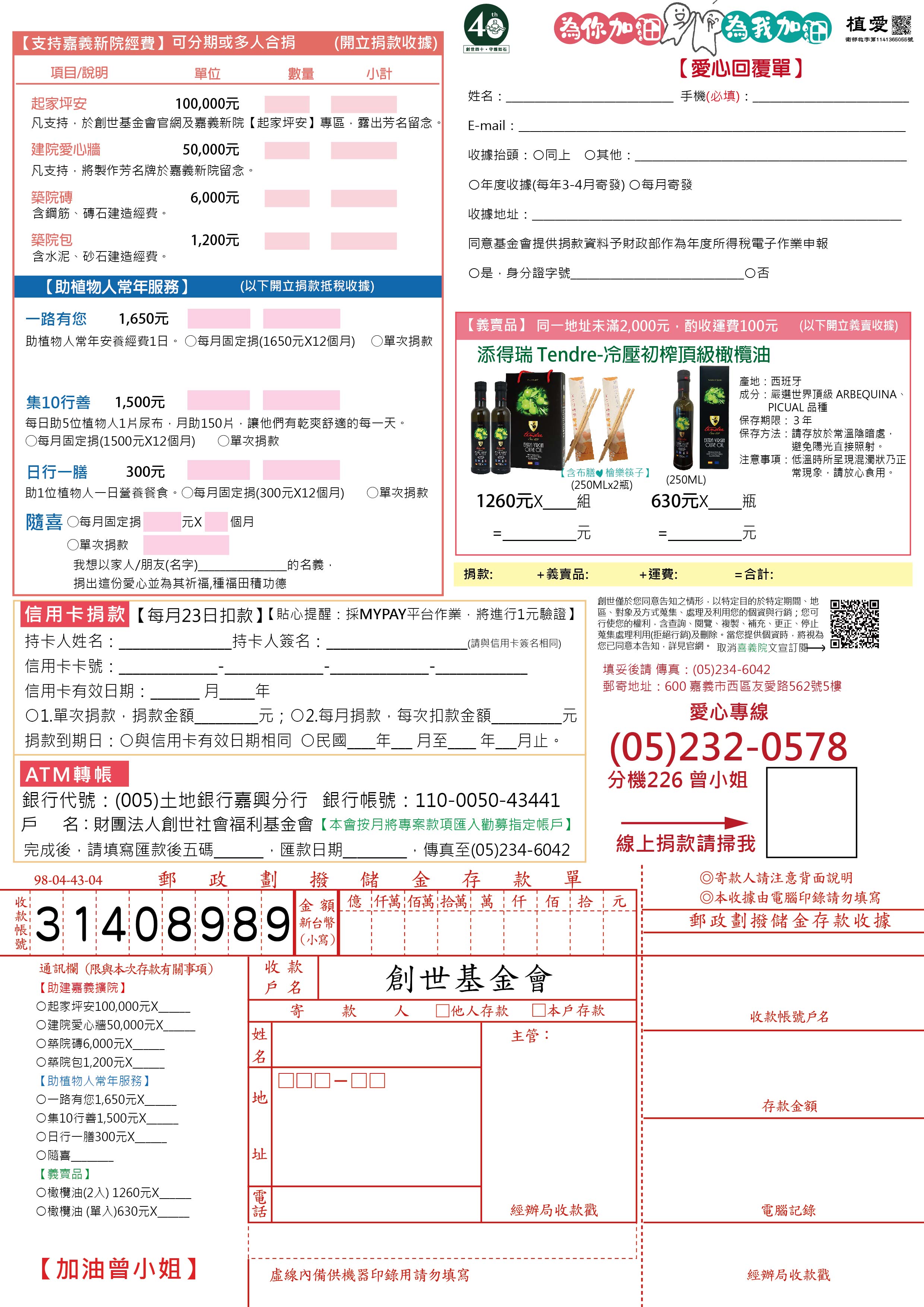 抬頭請開『財團法人創世社會福利基金會』,連同愛心回覆單掛號寄回【加油曾小姐】收。