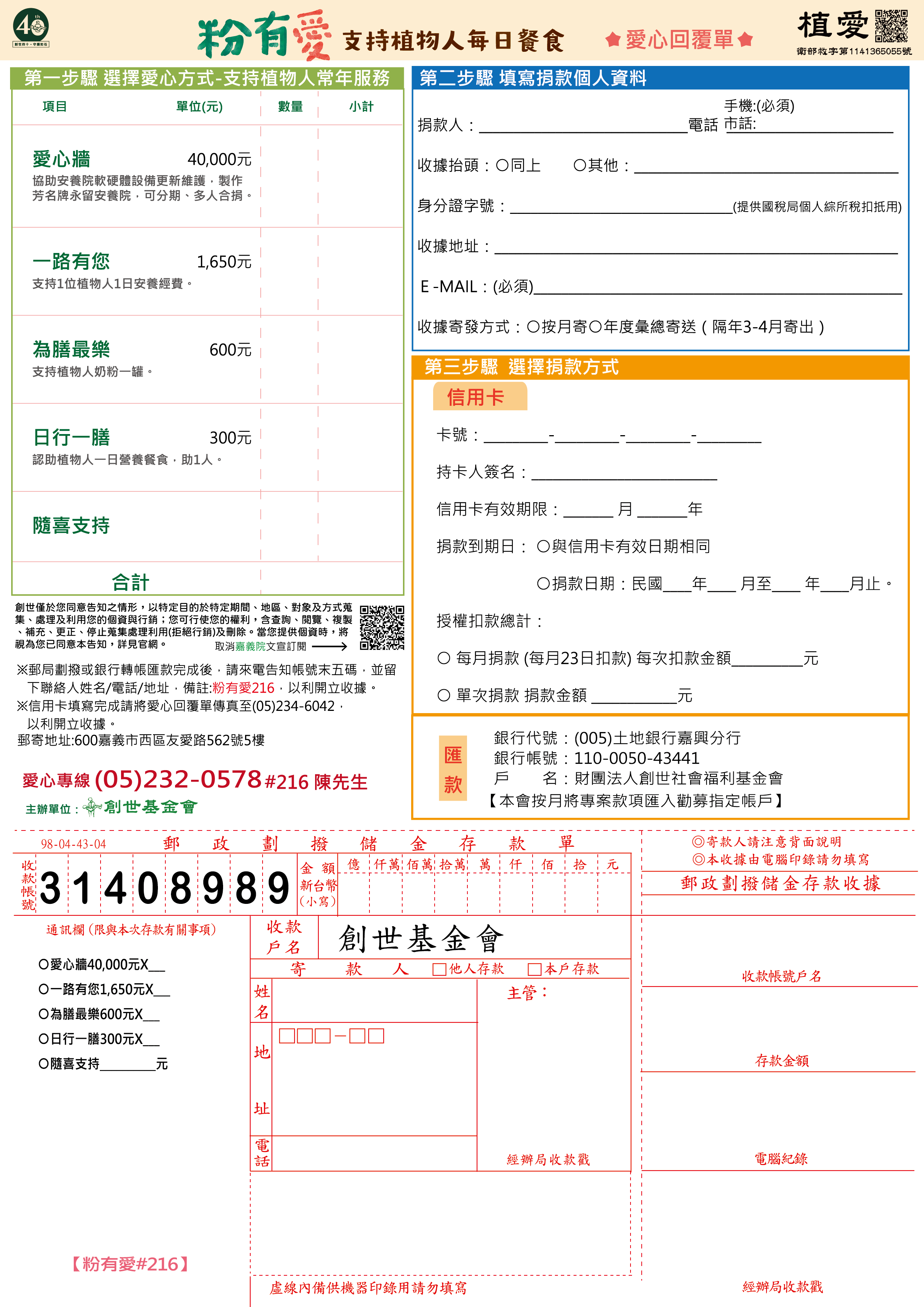 抬頭請開『財團法人創世社會福利基金會』,連同愛心回覆單掛號寄回有愛小組收。