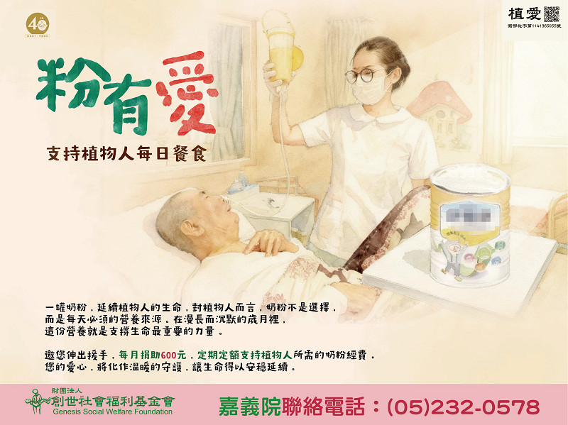 邀您伸出援手,每月捐助600元,定期定額支持植物人所需的奶粉經費。