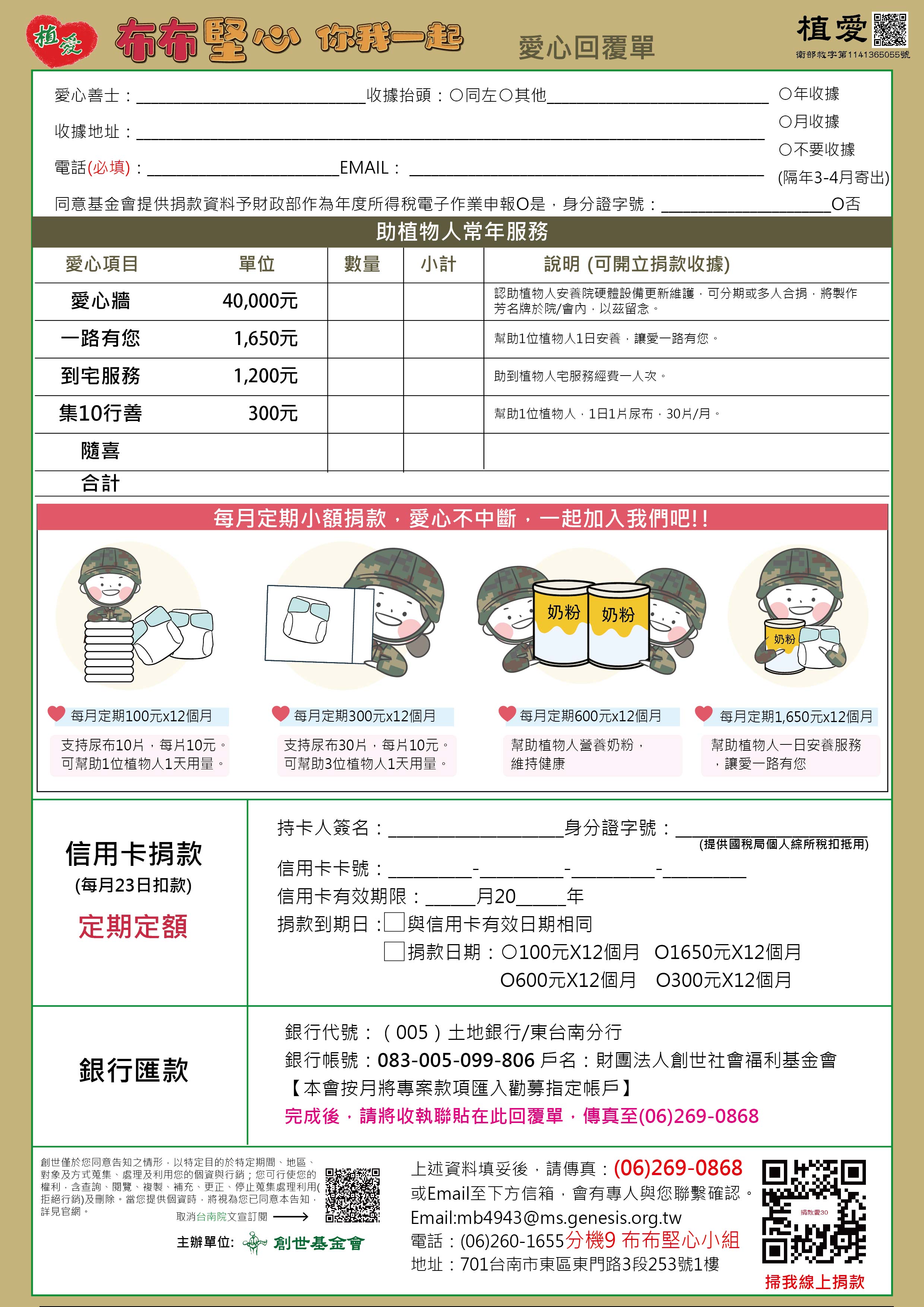 ※轉帳完成後,請來電告知帳號末五碼、收據抬頭、地址,或將存根聯、收據抬頭、電話、地址傳真至(06)269-0868,註明【布布堅心小組9】,以利開立收據。