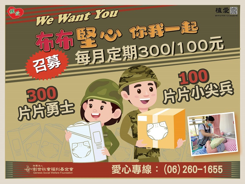 只要每天3.3元,每月定期100元,就可以幫助一位植物人一天的尿布需求。