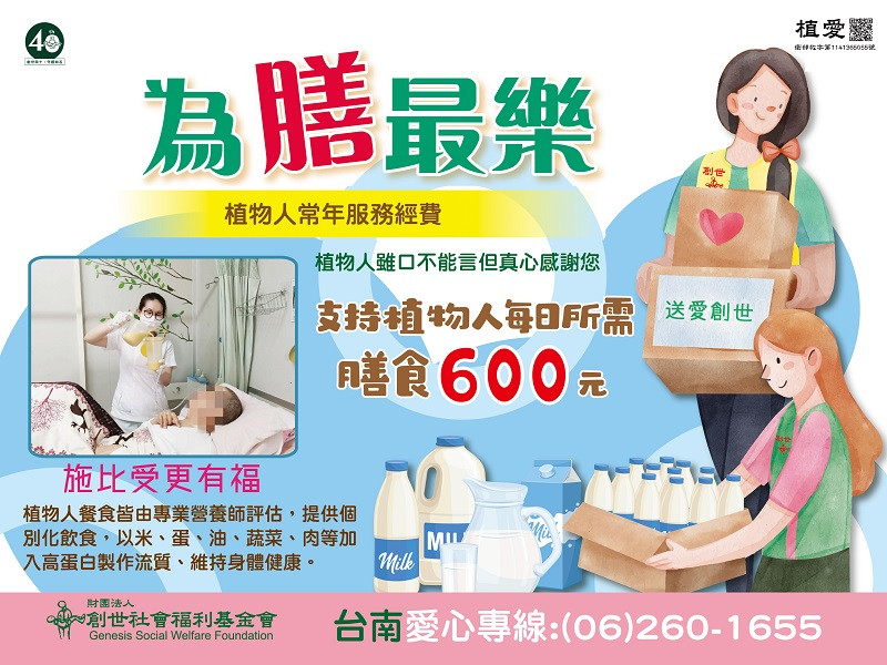 ■在院安養奶粉:植物人每天所需食用5-6餐,每餐須90克,每月300包全年需求3600包平均每位植物人一日營養餐食需300元,台南院60位院民,一年所需近700萬經費