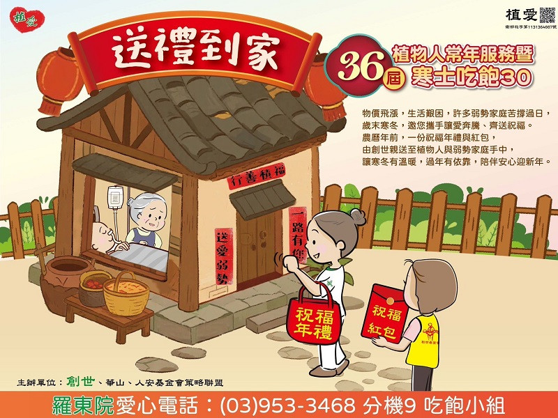 歲末寒冬,邀您攜手讓愛奔騰、齊送祝福。農曆年前,一份祝福年禮與紅包,由創世親送至植物人與弱勢家庭手中,讓寒冬有溫暖、過年有依靠,陪伴他們安心迎新年。