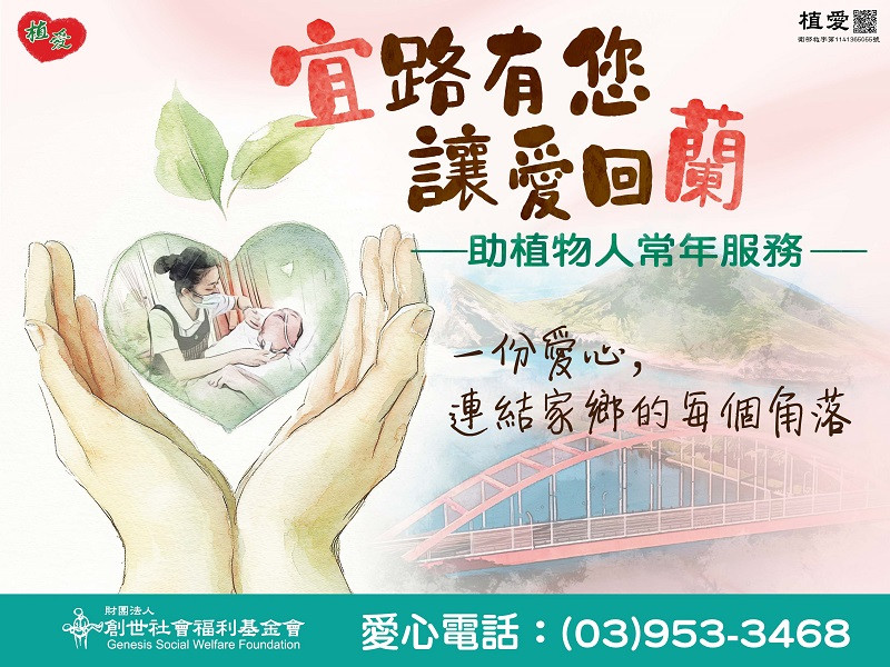 宜蘭這片土地充滿愛心,這份愛需要您的支持與參與,每一份愛心,都是創世繼續服務的動力;每一份支持,都是植物人家庭的希望。