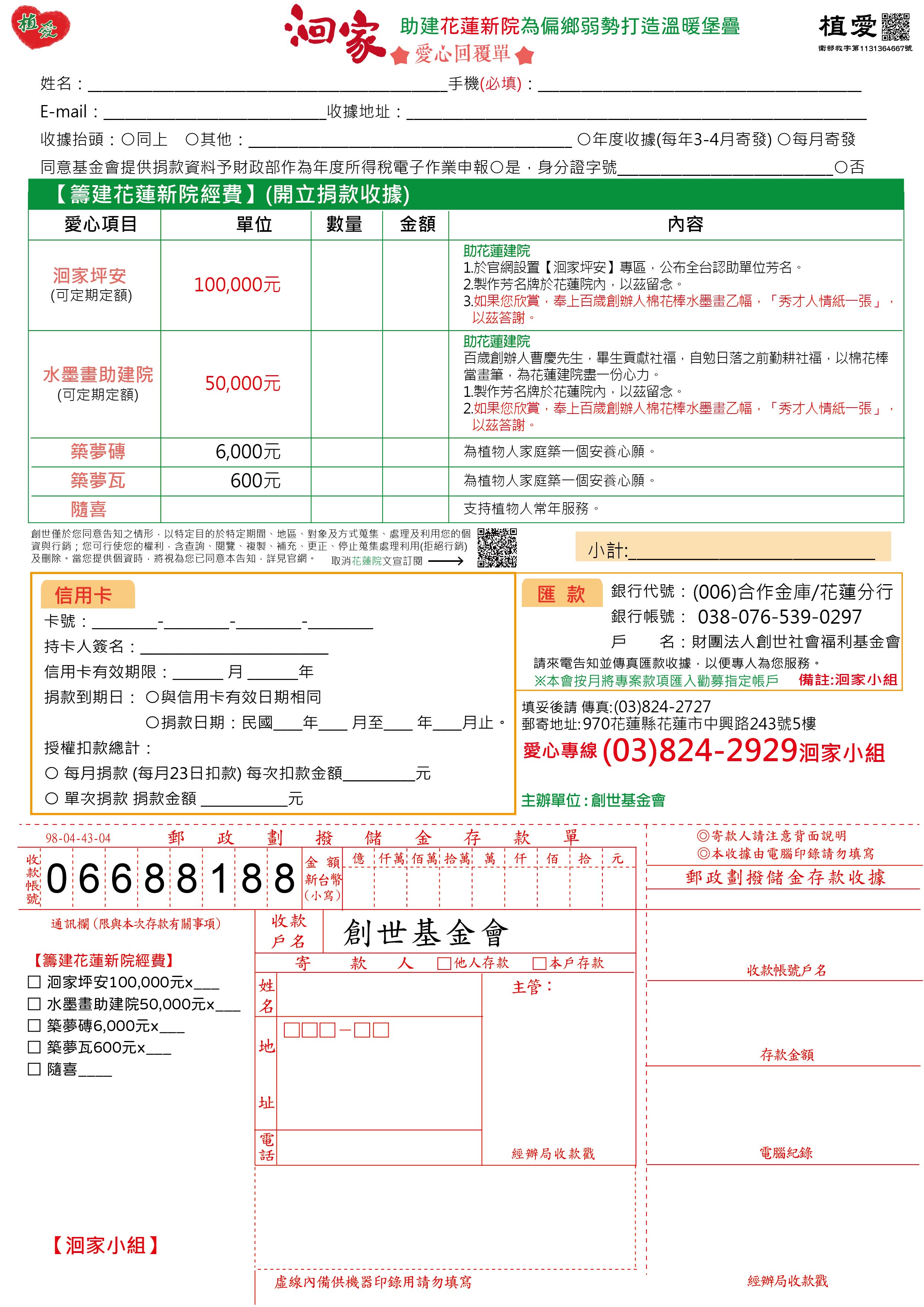 抬頭請開『財團法人創世社會福利基金會』,連同愛心回覆單掛號寄回洄家小組收。