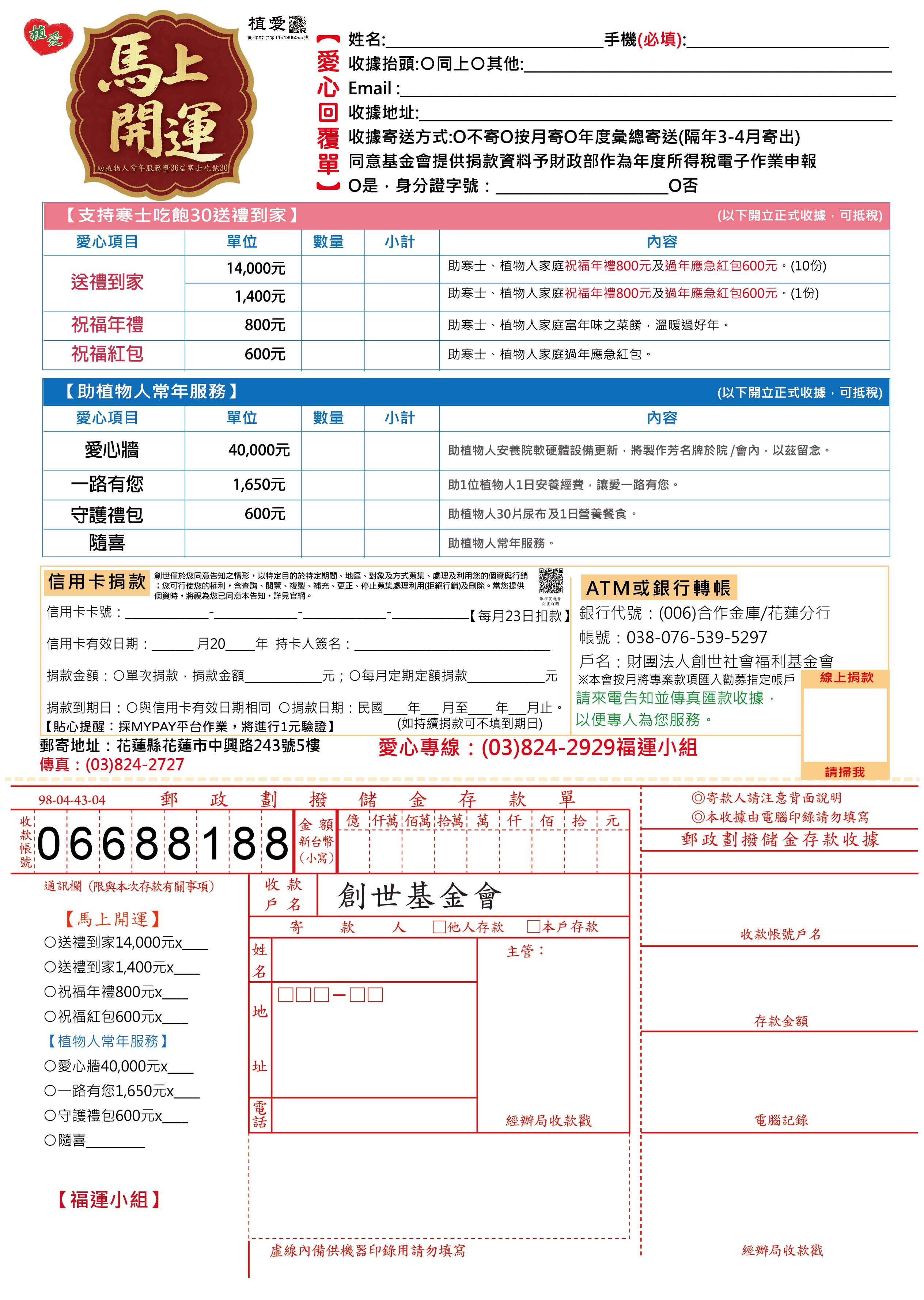 抬頭請開『財團法人創世社會福利基金會』,連同愛心回覆單掛號寄回【福運小組】收。